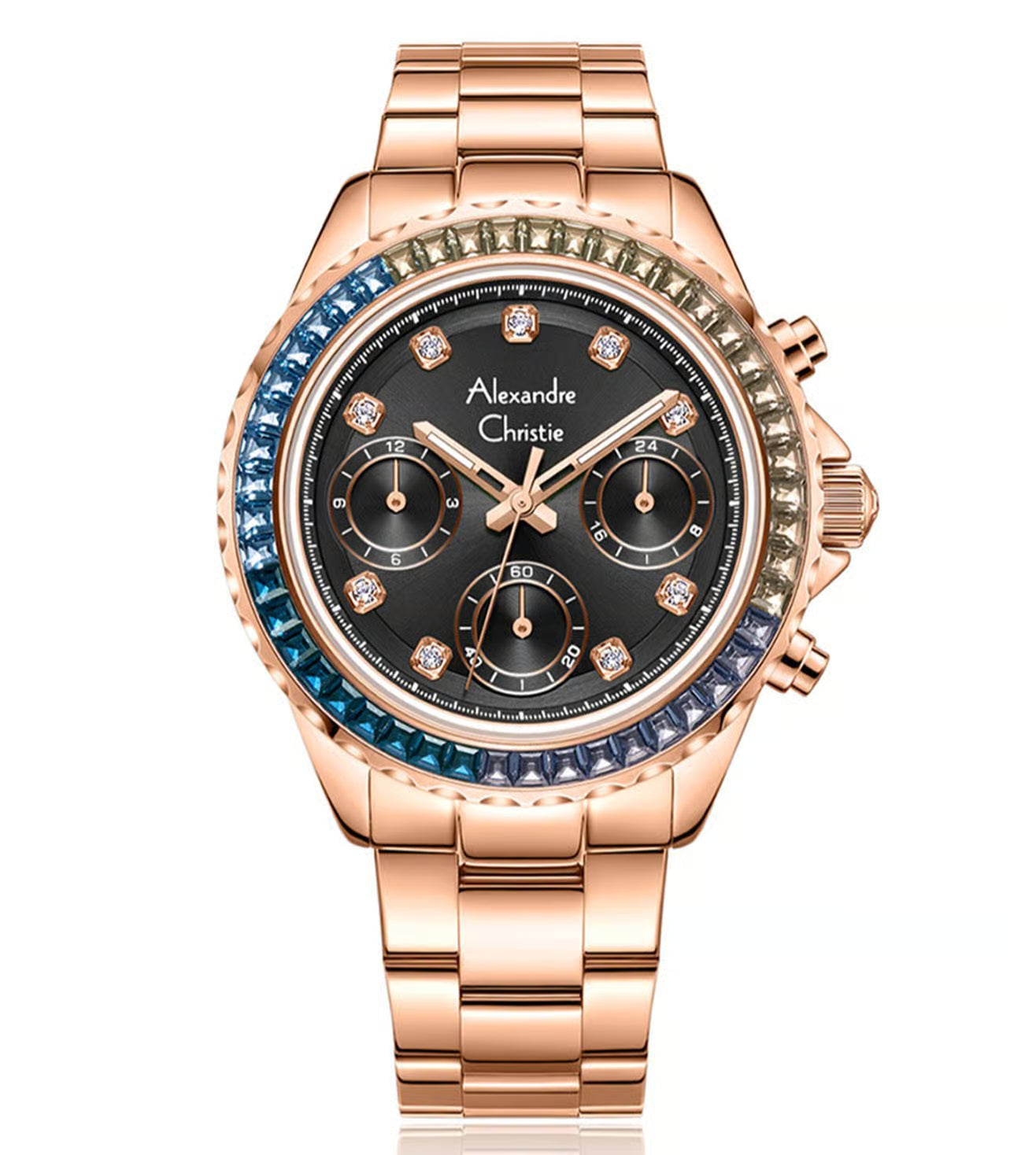 Introducing Alexandre Christie 2B13 BFB is a timepiece designed to display two separate time zones simultaneously. The watch face is a masterpiece of clarity and design, featuring two separate dials or sub-dials that meticulously display the hours and minutes of each time zone. The primary time is often indicated on the main dial, while an additional hand, sub-dial, or outer ring is dedicated to the second time zone.
