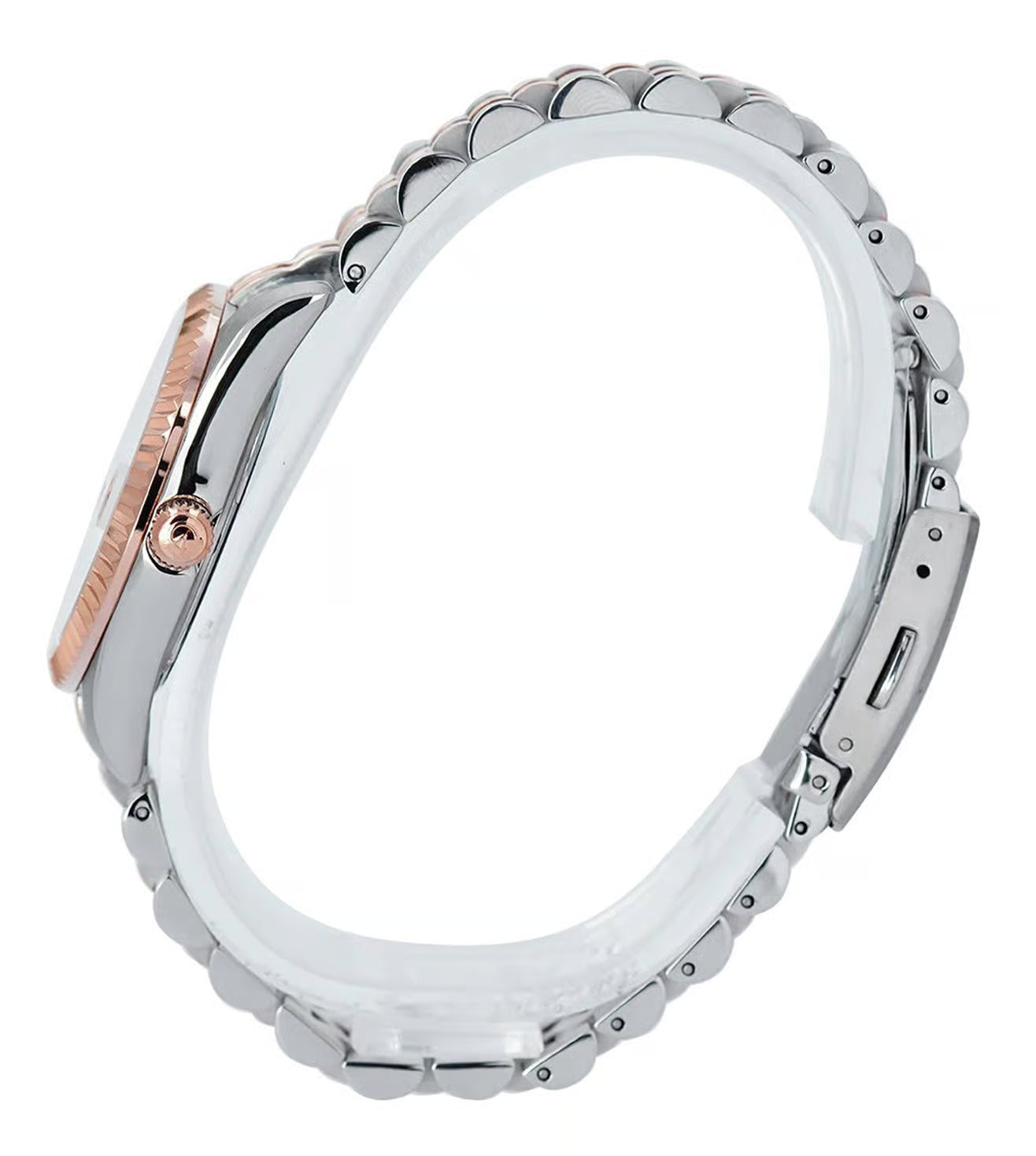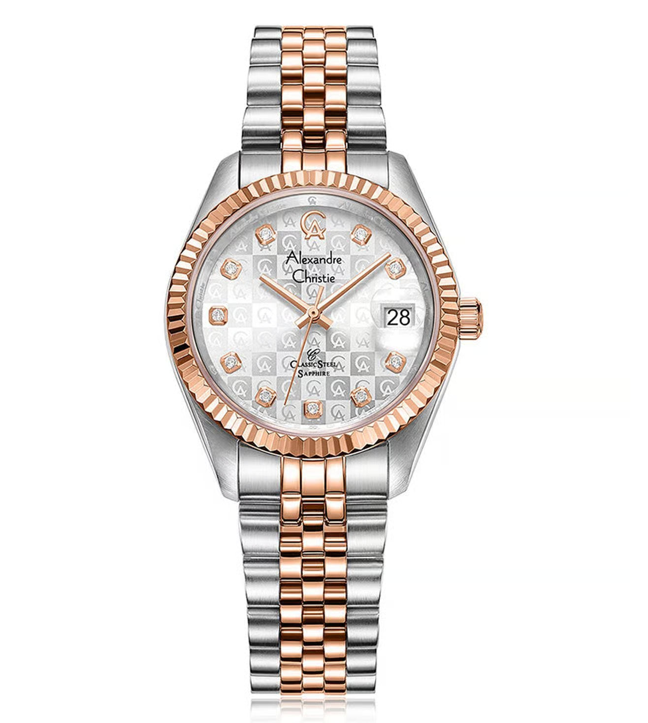 Lending a contemporary twist to an elegant design, this women's analog watch from Alexandre Christie is a must-have wrist essential. Its strap comes in a shade of rose gold that elevates the look of the watch. The rose gold round dial is secured by a sapphire crystal and is housed in a case with a crystal embellished bezel. It exudes plain 3-hand, and a crown for time adjustment. Furthermore, it is completed with a deployment clasp to ensure a secure fit on the wrist.