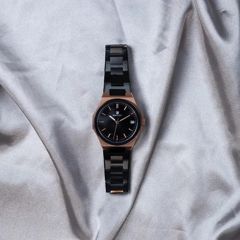 This luxurious Bentley timepiece is a radiant expression of feminine sophistication and timeless allure. Meticulously crafted for the modern woman, it showcases a harmonious fusion of rose gold and deep black tones, exuding elegance and opulence in equal measure. The lustrous black dial is gracefully accented with slender rose gold indices and dauphine-style hands, reflecting an understated yet powerful sense of style. At its core lies the precision-engineered Japan Miyota 2115 quartz movement, renowned for its flawless timekeeping and enduring reliability. A refined date window at 3 o’clock adds both functionality and balance to the dial’s pristine layout. The sapphire crystal glass, known for its exceptional hardness, offers uncompromising clarity and protection. Encased in a beautifully brushed bezel, the watch's seamless design flows into a two-tone bracelet that hugs the wrist with both strength and grace. Every detail is a testament to Bentley’s legacy of masterful watchmaking. This is not merely a timepieceâ€â€it is an exquisite jewel of horology, tailored for the woman who commands elegance.