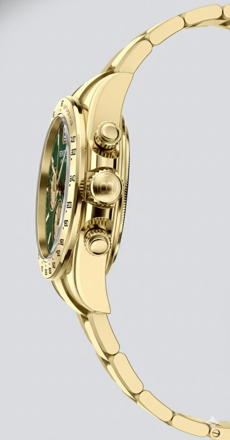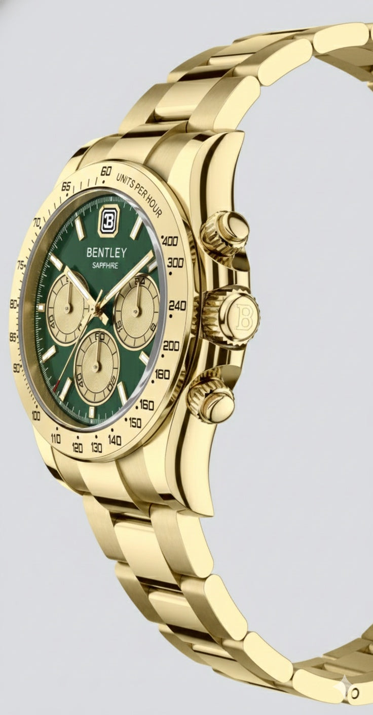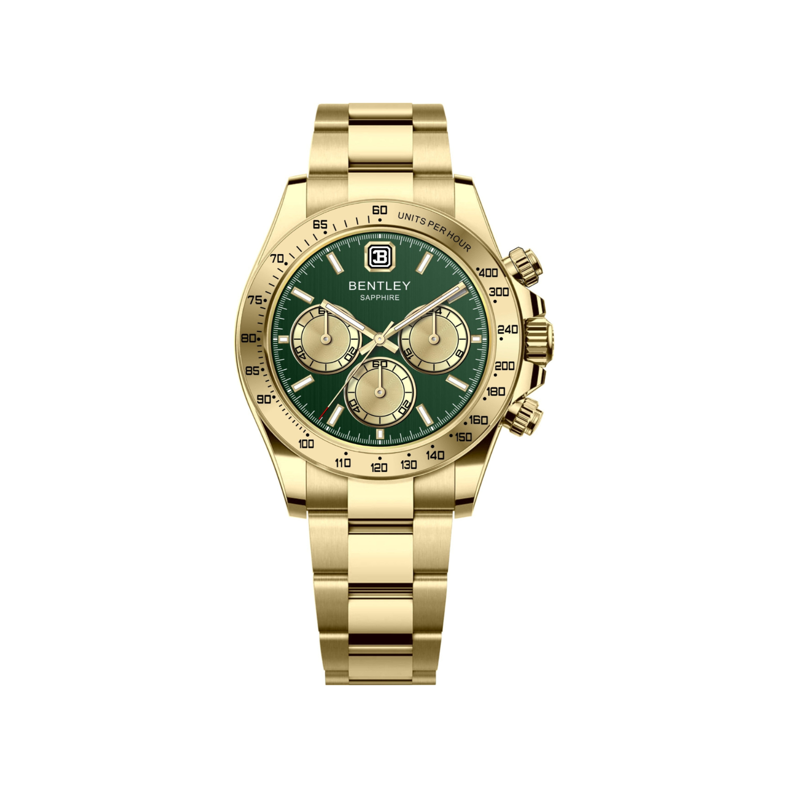 | This luxurious Bentley timepiece exudes sophistication with its radiant gold-tone stainless steel case and bracelet, perfectly contrasted by a rich emerald green dial. At its heart lies the precision-engineered Seiko-VD53 movement, offering reliable chronograph functionality and accurate timekeeping. The dial features three detailed sub-dials and is protected by a scratch-resistant sapphire crystal, ensuring lasting durability and clarity. Framed by a sporty tachymeter bezel, this watch seamlessly blends classic elegance with modern performance, making it an ideal accessory for both formal occasions and daily wear. |