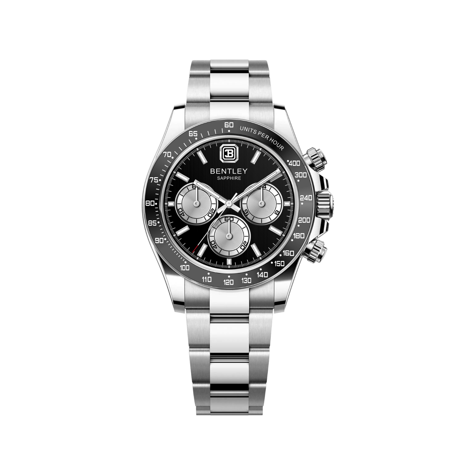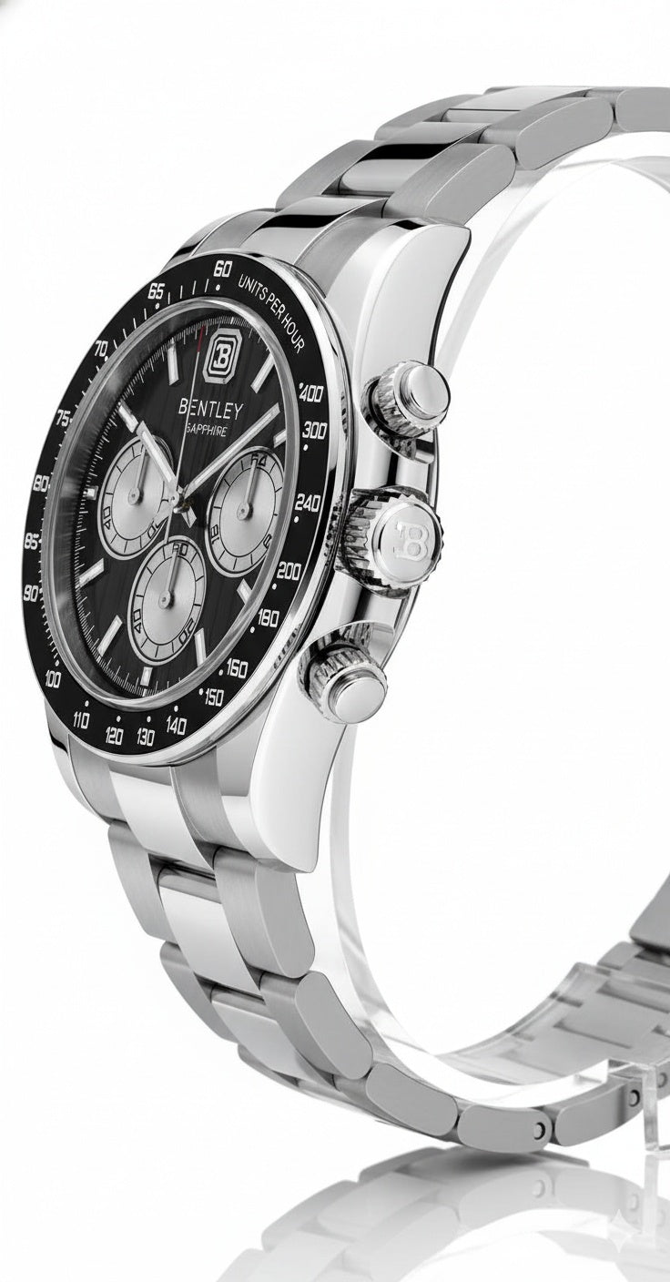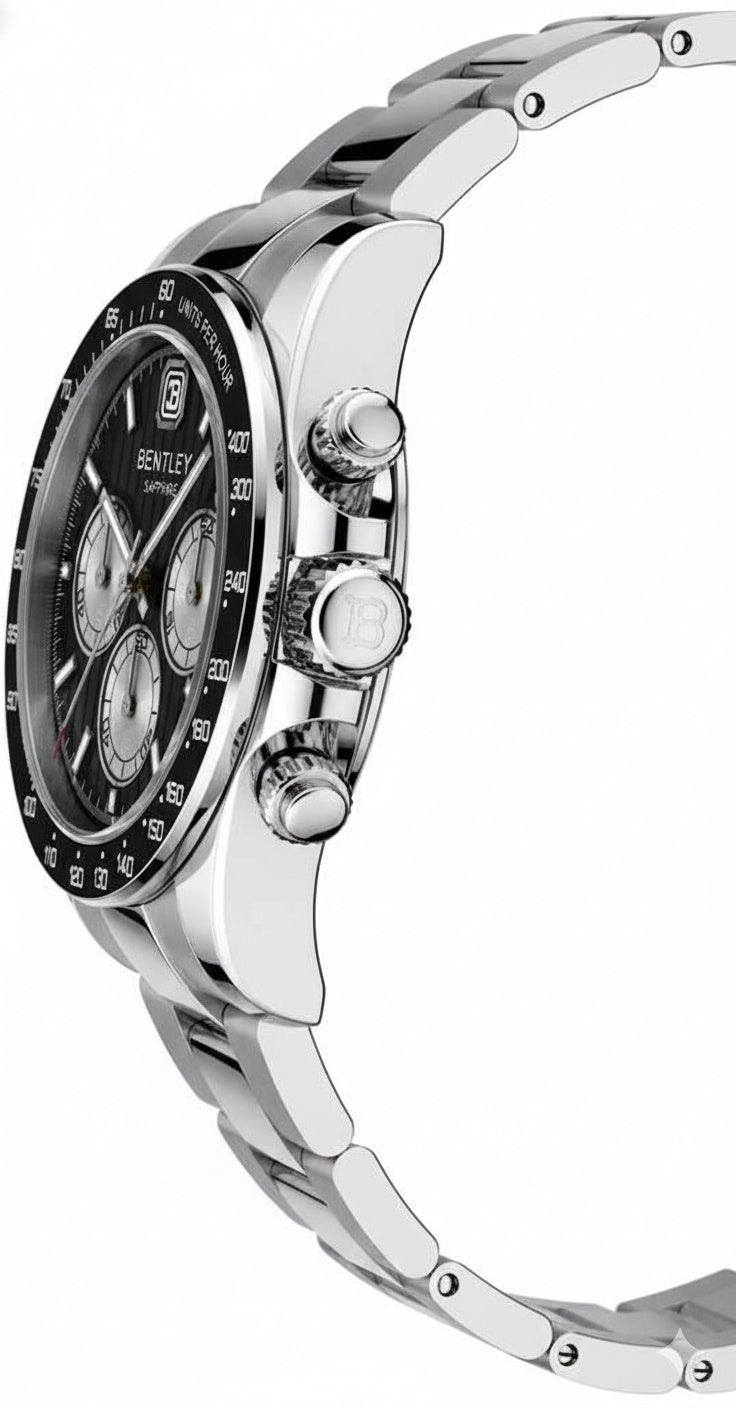 | Exuding a blend of sportiness and luxury, this Bentley chronograph features a striking black dial with contrasting silver sub-dials and luminous markers, all protected by a premium sapphire crystal. The robust stainless steel case is paired with a sleek tachymeter bezel, making it a stylish companion for any occasion. At its heart beats the reliable Seiko-VD53 quartz movement, ensuring exceptional accuracy and smooth chronograph performance. The polished link bracelet completes the sophisticated look, offering both durability and comfort on the wrist. This timepiece perfectly balances modern design with precision engineering for the discerning wearer. |