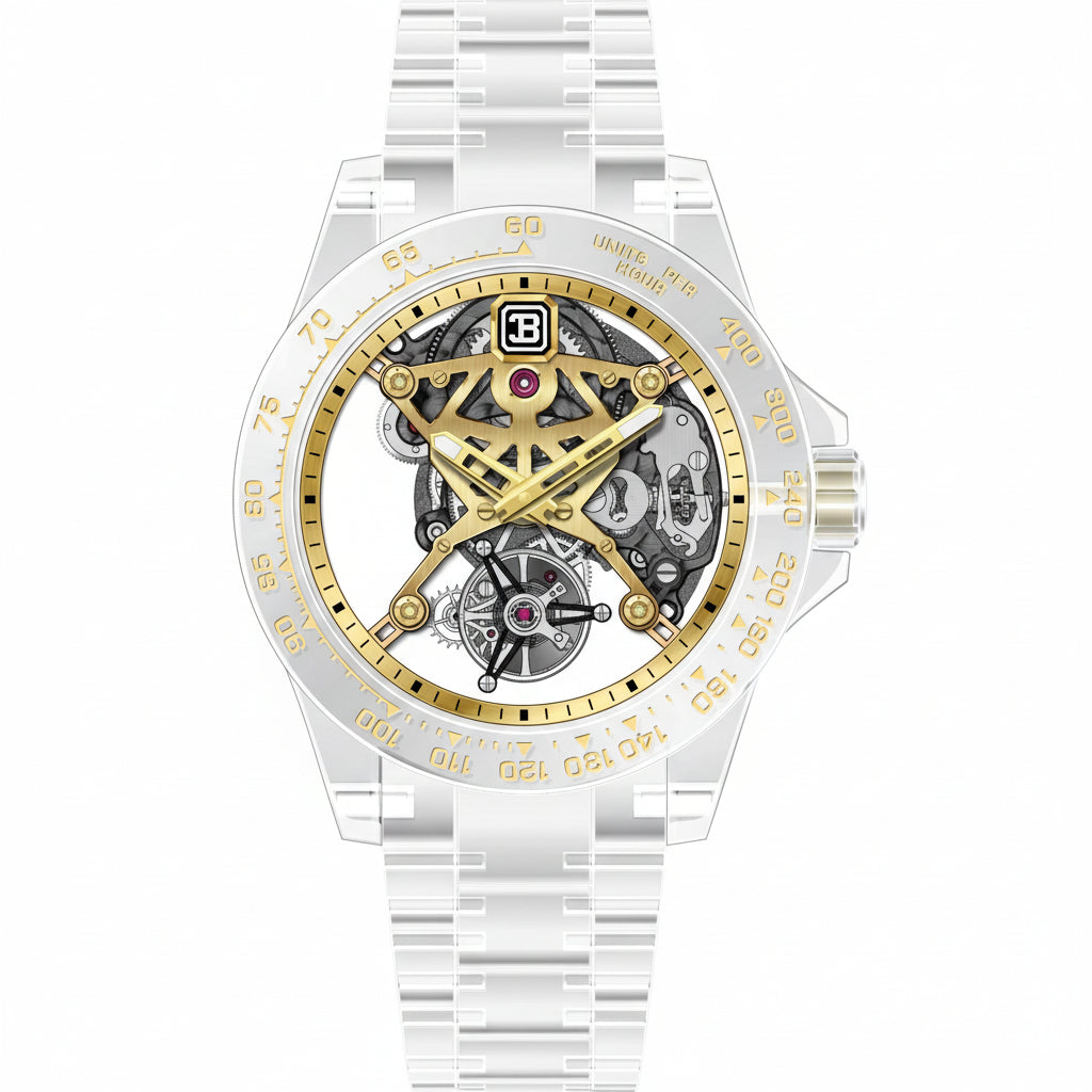 | This Bentley timepiece embodies refined luxury, powered by the exceptional BX8986 tourbillon movement that showcases true mechanical artistry. The skeletonized dial reveals intricate inner workings, highlighted by elegant gold-toned bridges for a bold, sophisticated look. A precision tachymeter bezel enhances its sporty yet premium character, reflecting Bentley’s performance-driven spirit. Crafted with premium materials, the watch delivers durability, accuracy, and commanding wrist presence. Designed for collectors and connoisseurs, it perfectly blends innovation, elegance, and high horology excellence. |