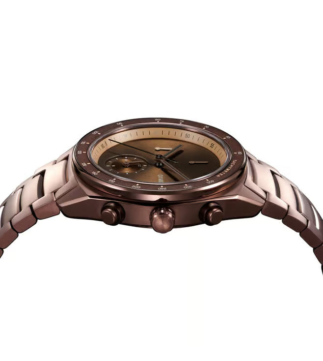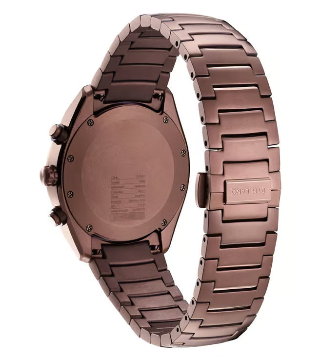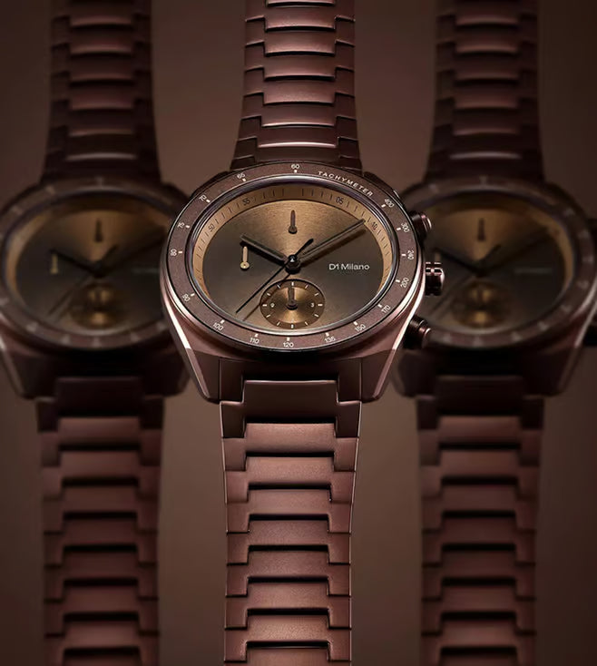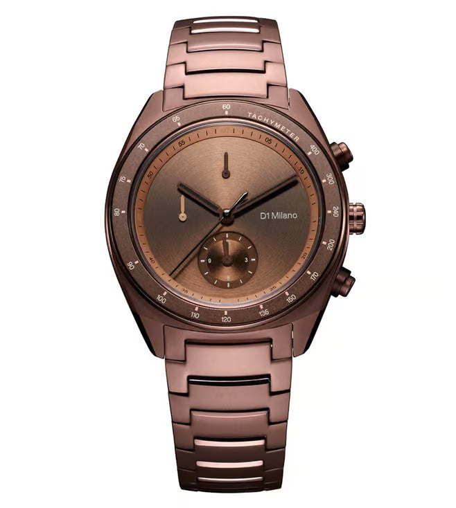 The new chronograph Essential Brown combines precision engineering with minimalistic design, featuring sandblasted stainless steel case and bracelets in Brown finish with clean lines, durable materials, and EPSON YM92 quartz movement. The design ethos of the D1 Milano Chronograph collection centers around minimalism and clean lines. Each timepiece features a dial that is free from unnecessary clutter, focusing instead on readability and simplicity. The choice of stainless steel as the primary material for the case and bracelet ensures durability and a premium feel.