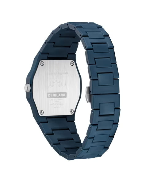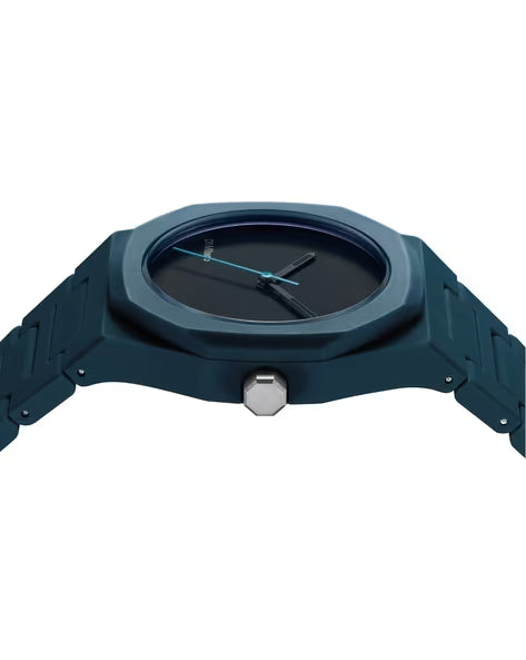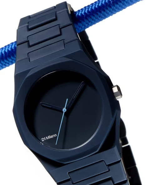 Designed to suit the preference of urban men, this analog watch watch from the collection by D1 Milano is sure to make a style statement. secured by a mineral glass, the blue round dial is protected in a case. it exhibits crown for time adjustment. the polycarbonate strap flaunts a bluehue that accentuates the look of the watch. moreover, it is fitted with a fold-over clasp with double push button safety clasp to ensure a secure fit on the wrist.