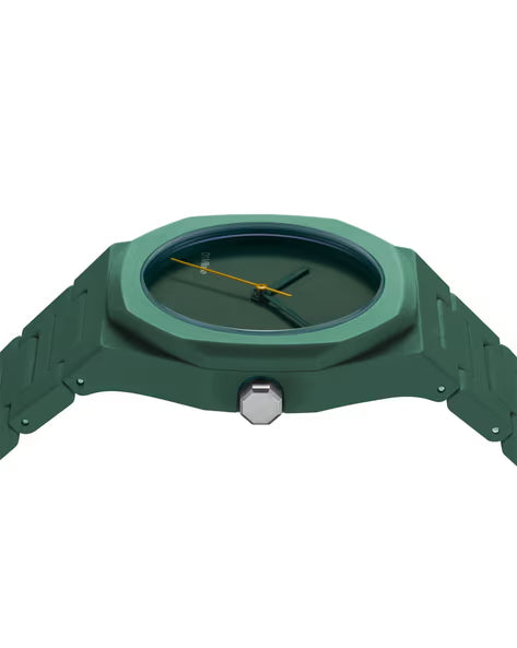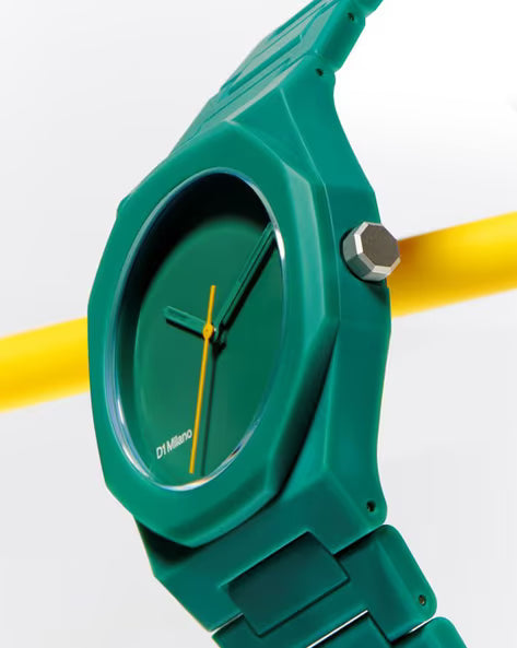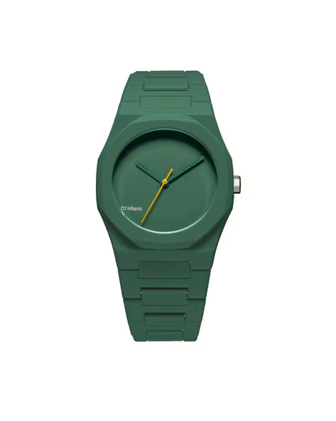 Designed to suit the preference of urban men, this analog watch watch from the collection by D1 Milano is sure to make a style statement. secured by a mineral glass, the green round dial is protected in a case. it exhibits crown for time adjustment. the polycarbonate strap flaunts a greenhue that accentuates the look of the watch. moreover, it is fitted with a fold-over clasp with double push button safety clasp to ensure a secure fit on the wrist.