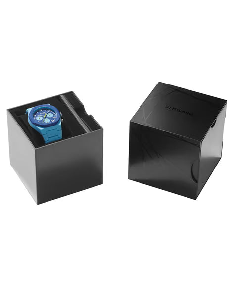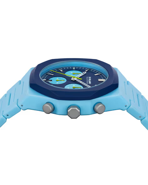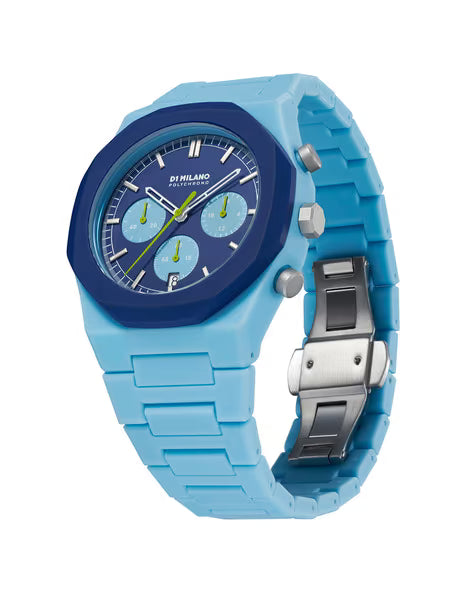 The polychrono combines the funny and irreverent identity of the polycarbon with a quartz movement and fly-back function. Pop, fresh and witty. Spark the moment with this new iconic timepiece. The stainless steel strap comes in a blue hue that further elevates the look of the timekeeper. Besides, it is completed with a fold-over pith button clasp with safety to ensure a secure fit on the wrist.