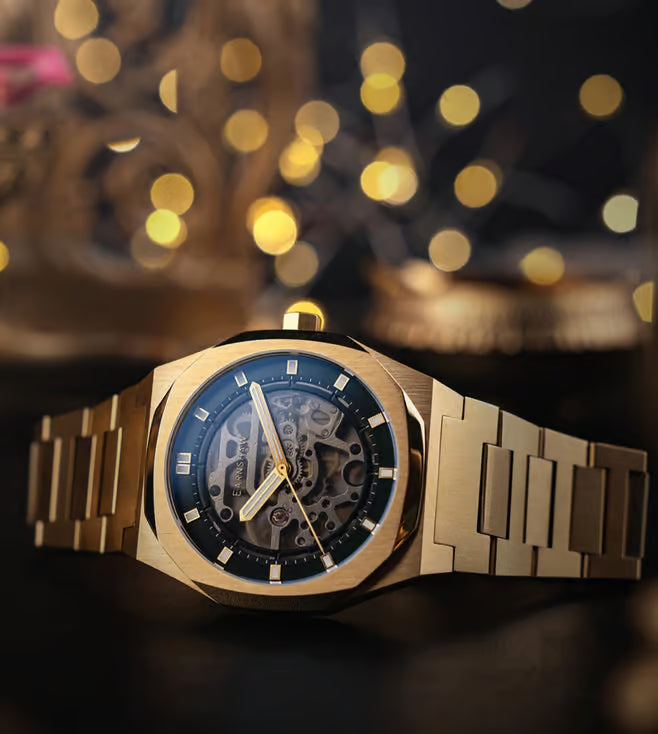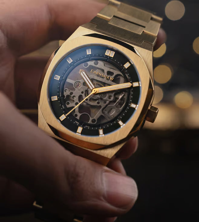 A must-have timepiece for all the watch aficionados, this men's analog watch from EARNSHAW will be a perfect pick. The green round dial is protected by a mineral glass. It has a crown for time adjustment. Stylish and sophisticated, the Drake displays the inner workings of its self-powered, skeleton Automatic movement through the dial. A full expression of centuries of watchmaking.