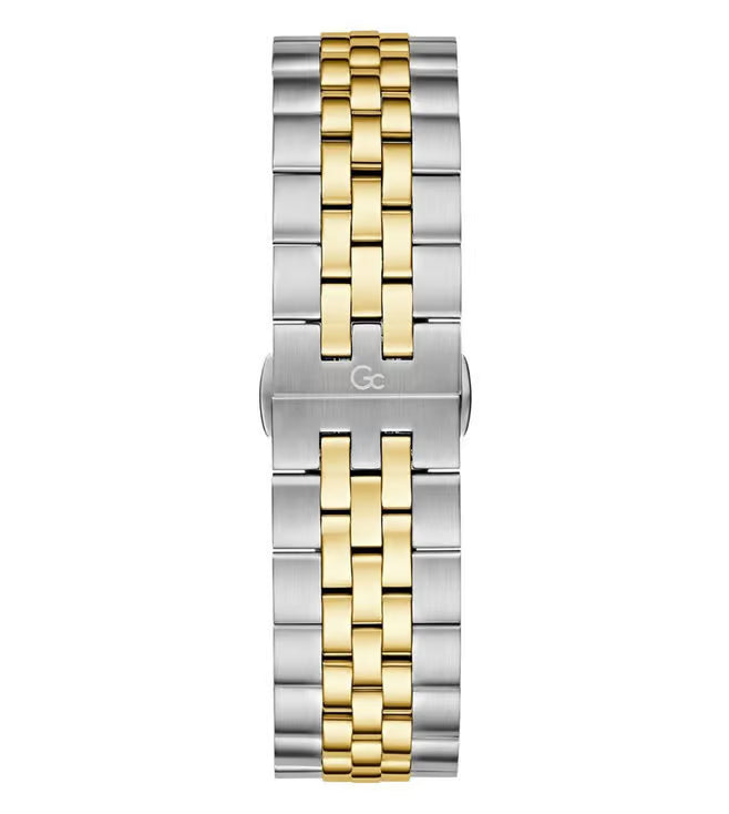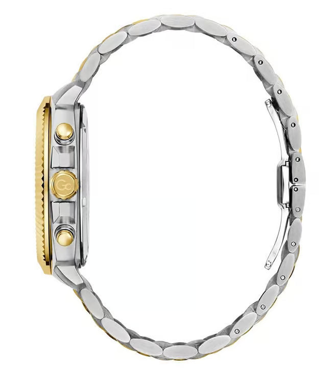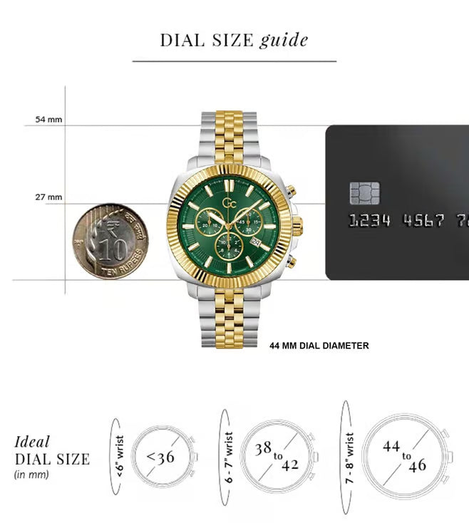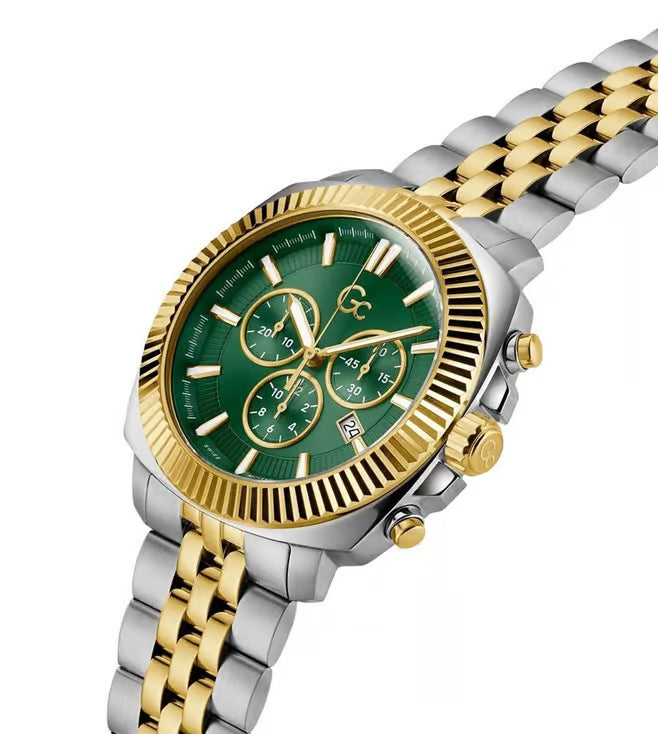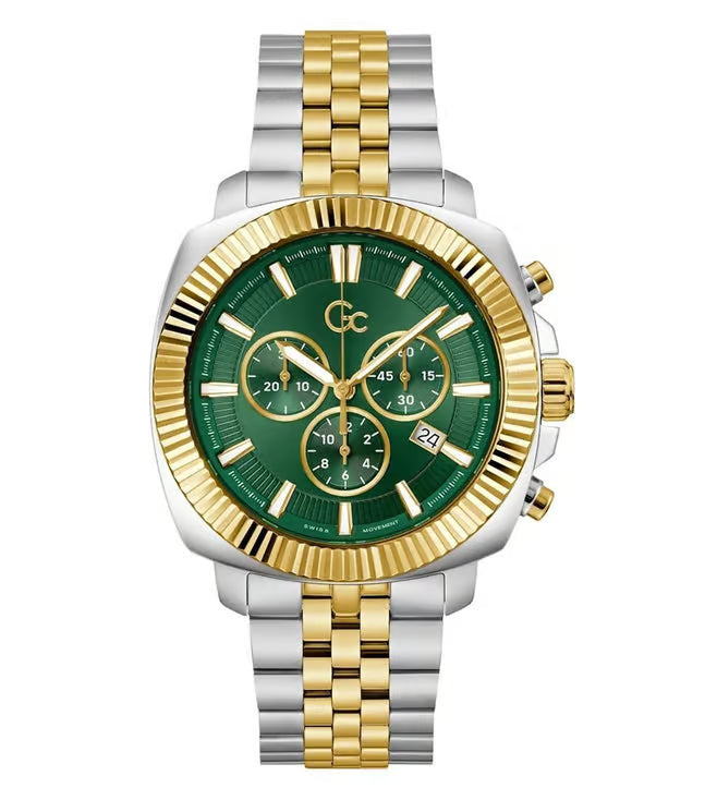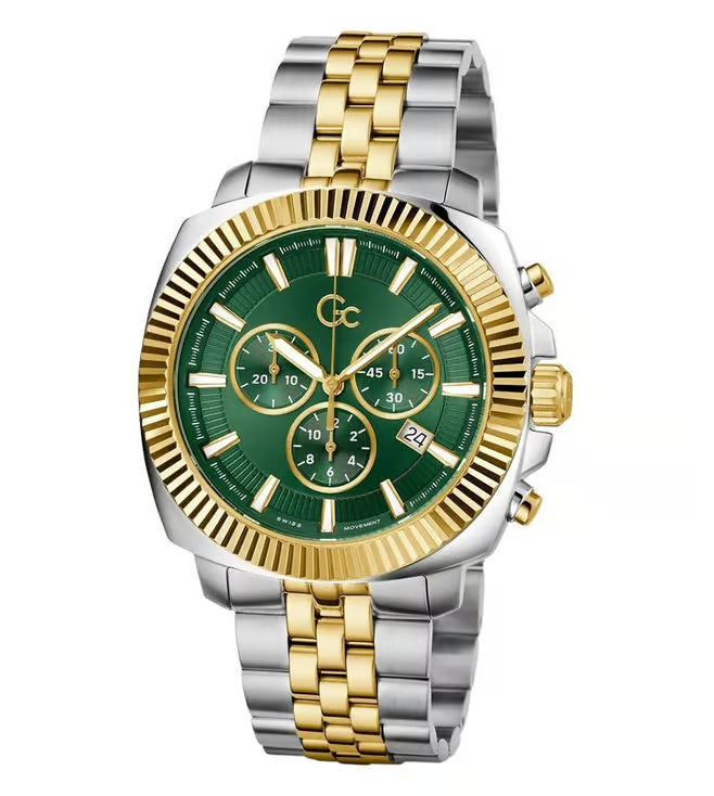 Presented in a stylish design, this men's analog watch from the Flair Coussin collection by Gc will be a great addition to your watch collection. Its stainless steel strap exudes a silver & gold hue that accentuates the look of the watch. Encased in a 44 mm case, the green round dial is functional on a quartz movement. It features chronograph. Besides, it is completed with a deployment clasp with push button clasp to ensure a secure fit on the wrist.