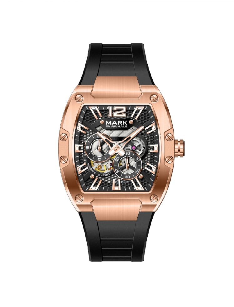 Introducing the epitome of elegance and modern engineering: this luxurious timepiece seamlessly blends timeless design with contemporary flair. Encased in a radiant rose-gold-toned frame, it exudes sophistication at every glance. The intricately detailed dial, featuring a honeycomb-patterned background, reveals a symphony of mechanical artistry, showcasing the beauty of precision craftsmanship. \n \nThe watch's multi-functional chronograph subdials are framed with finesse, while bold, luminous hands and indices ensure effortless readability. Accentuated by robust screws on the bezel, this piece reflects a harmonious balance of rugged strength and refined luxury. \n \nComplemented by a durable black rubber strap for ultimate comfort and a touch of sporty charm, this watch is perfect for those who demand both style and performance. Designed for the discerning individual, it is not just a timepiece but a statement of taste and ambition.