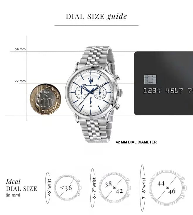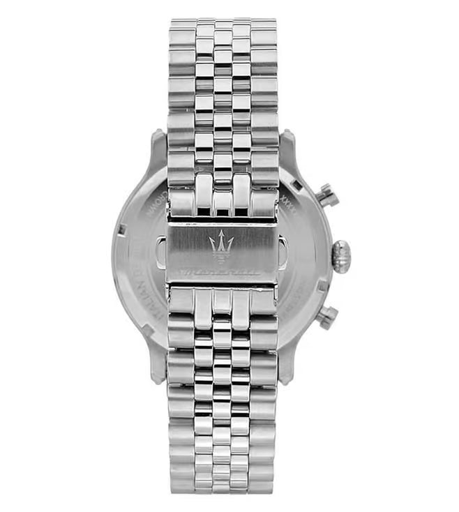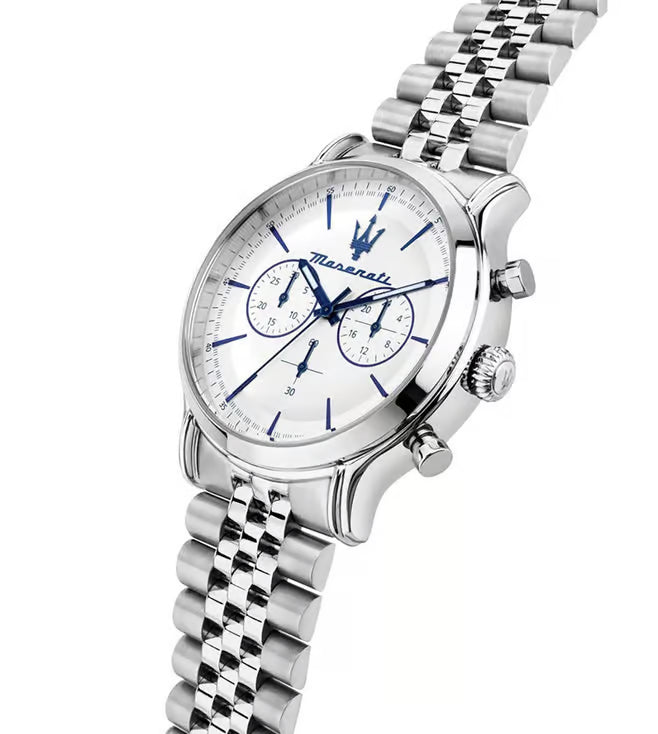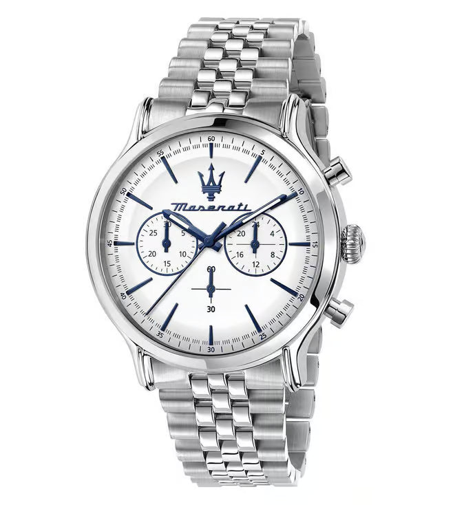MASERATI EPOCA MEN'S WATCH R8873618034. Chronograph watch with MVT.JS20 AIG 1.4 movement. Silver colour. Materials: Steel. WHITE mineral glass dial. MATT with 6 applied index hands, polished and satin finish. Case dimensions: 42. Solid steel strap in steel colour. Closure: DEPLOYANTE buckle with buttons.