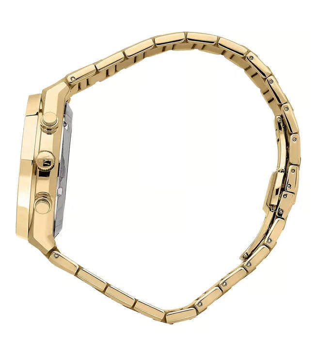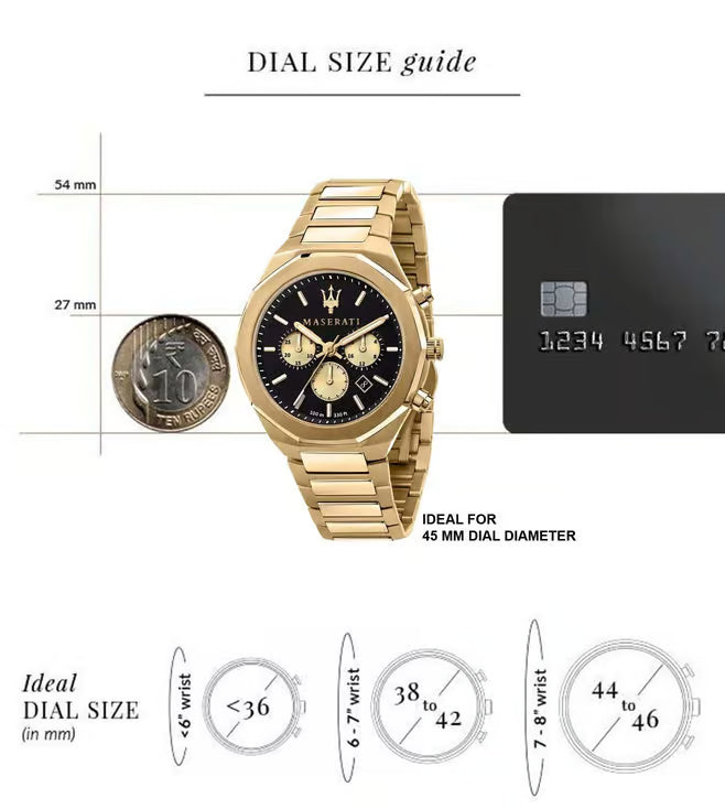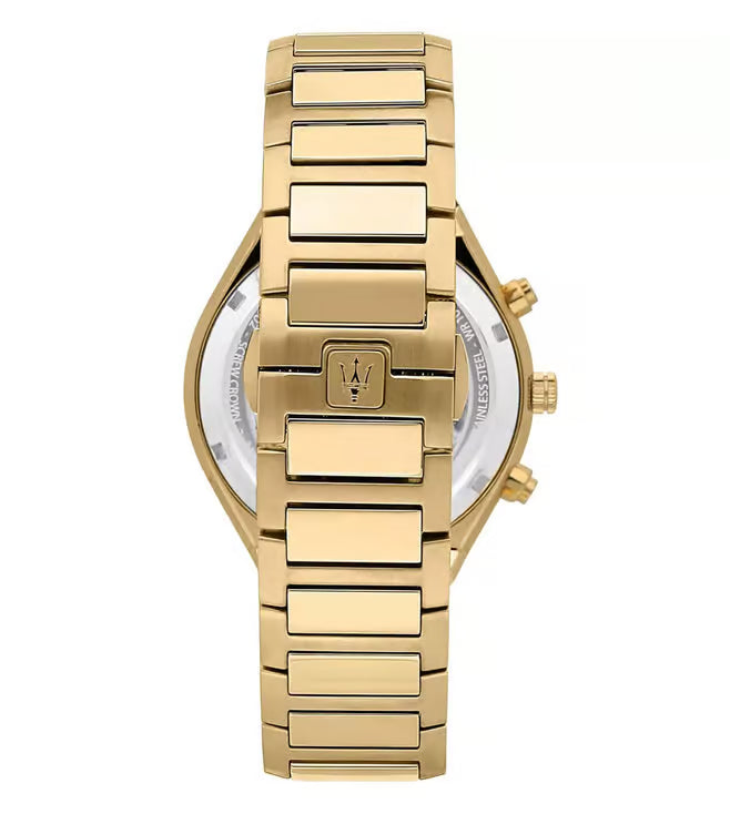 Style arrives effortlessly the moment you wear this smartly designed men's analog watch from the Sfida collection by Maserati. Operated by a manual movement and safeguarded by a mineral glass, the black round dial is encased. The stainless steel strap vaunts a gold hue that enhances the look of the timekeeper. Moreover, it is fitted with a deployment clasp with push buttton clasp that ensures a secure fit on the wrist.