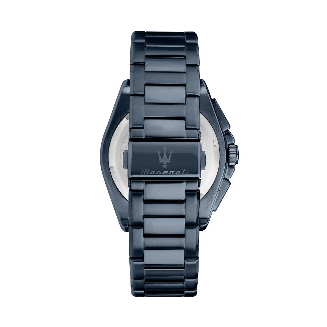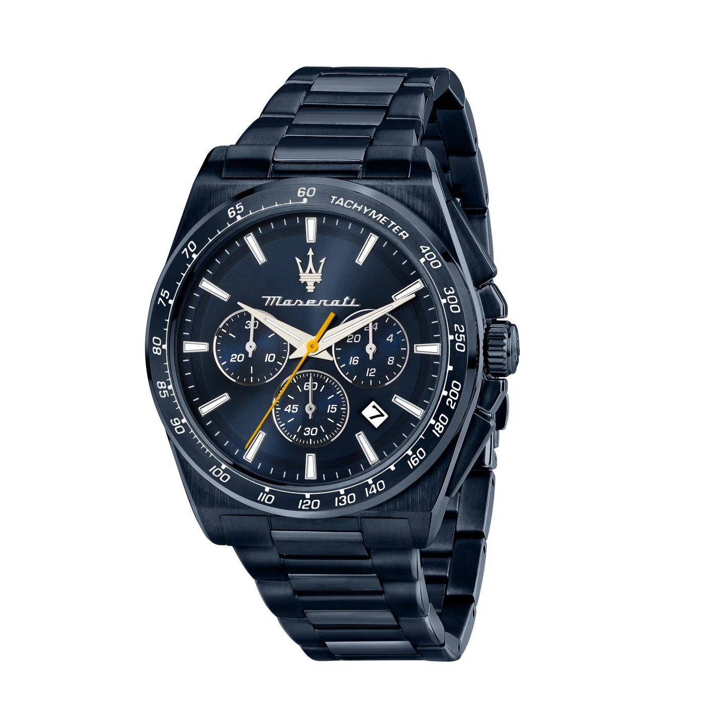 This Maserati watch has a case made of stainless steel with a diameter of 43 mm and is fitted with a metal band. Inside the case lies a Miyota movement and the watch features a Mineral crystal.