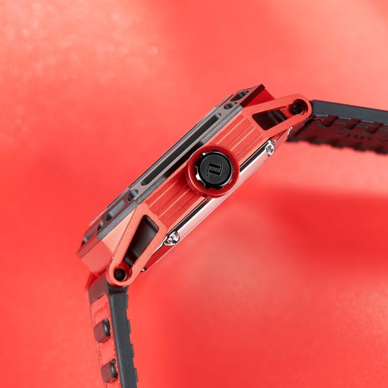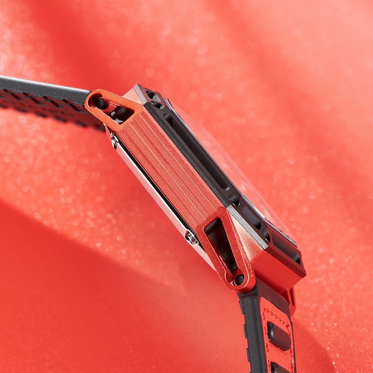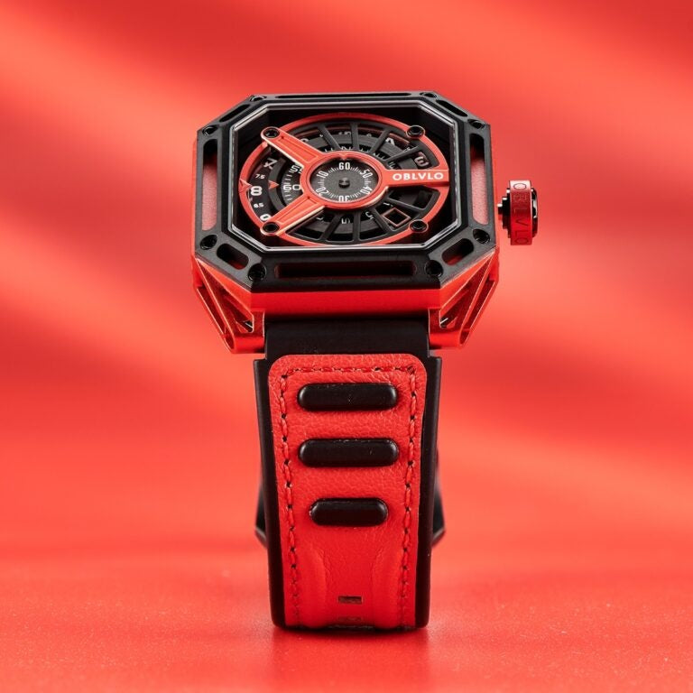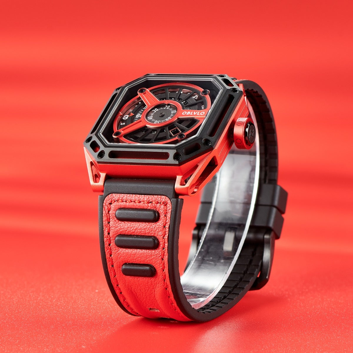 The "AK-E-RBRR" watch from OBLVLO is a men's sports watch with a hollow skeleton dial, a 45mm big dial, and a luminous feature. It uses an automatic self-winding mechanical movement and is housed in a 316L stainless steel case. The watch features a high-quality imported Italy calf-skin leather rubber strap and a synthetic sapphire crystal for scratch resistance. It's water-resistant up to 5ATM, suitable for swimming.ÂÂ