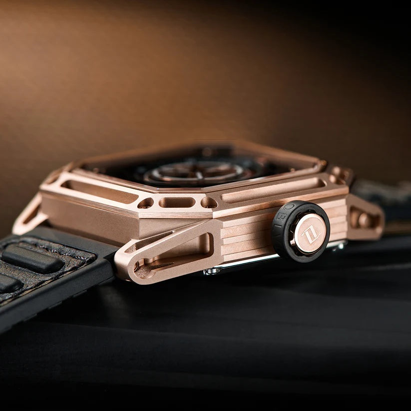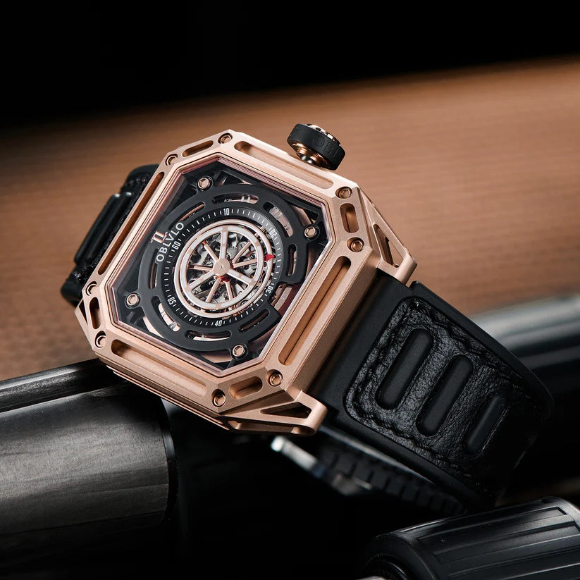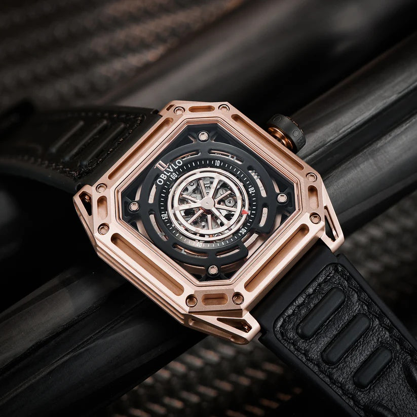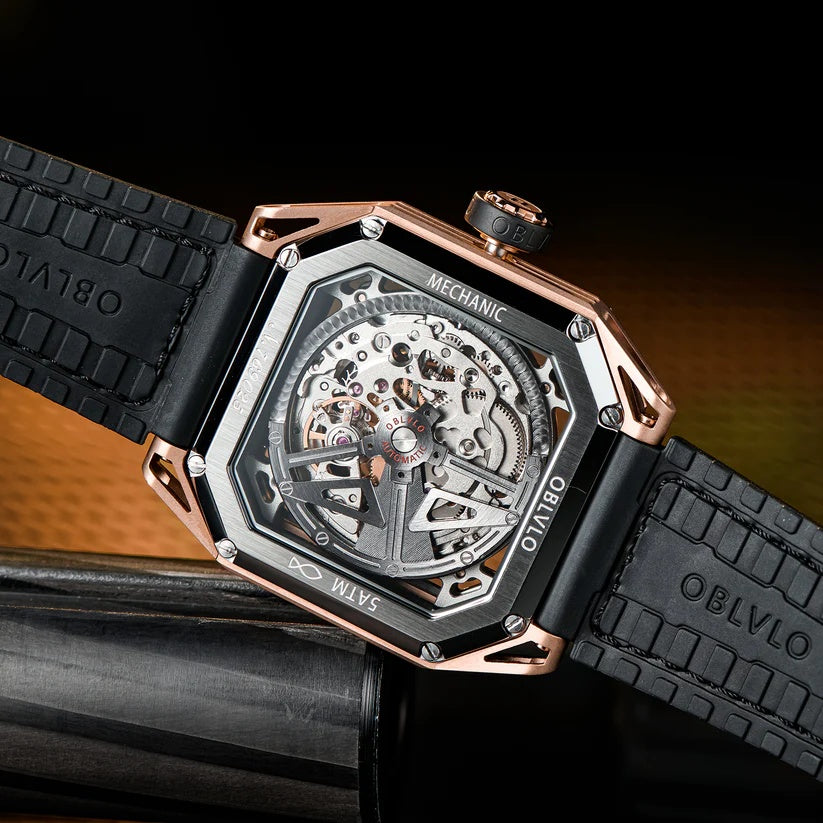 The OBLVLO AK-S-PBB is a luxury, automatic, self-winding, skeleton watch with a 42mm case, designed for men. It features a stainless steel case, a rubber band, and a sapphire crystal dial window. This watch is known for its cool skeleton design, allowing a view of the intricate inner workings, and its automatic movement that ensures accurate timekeeping. It's also water-resistant up to 5ATM, making it suitable for various weather conditions.ÂÂ