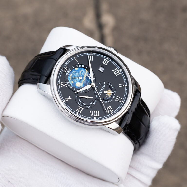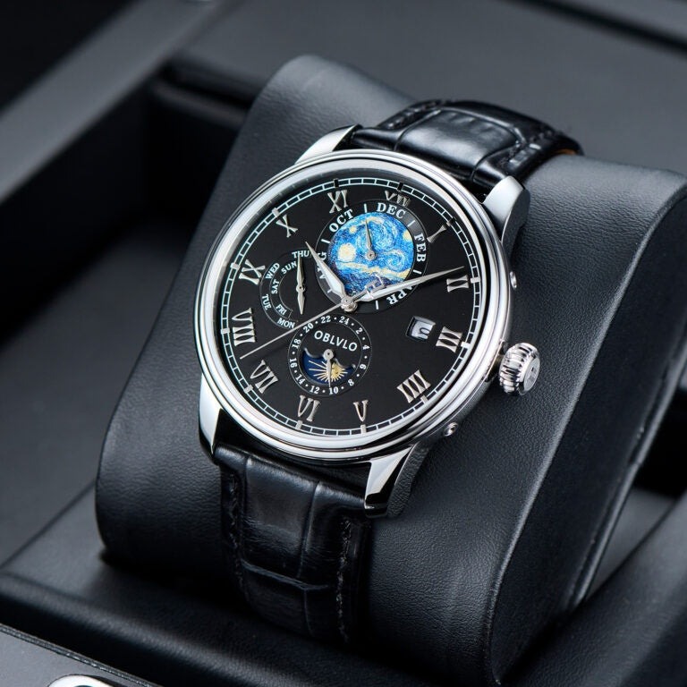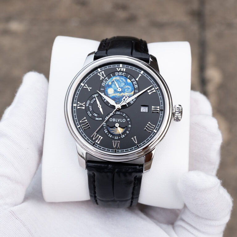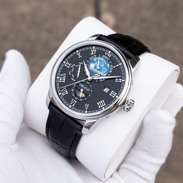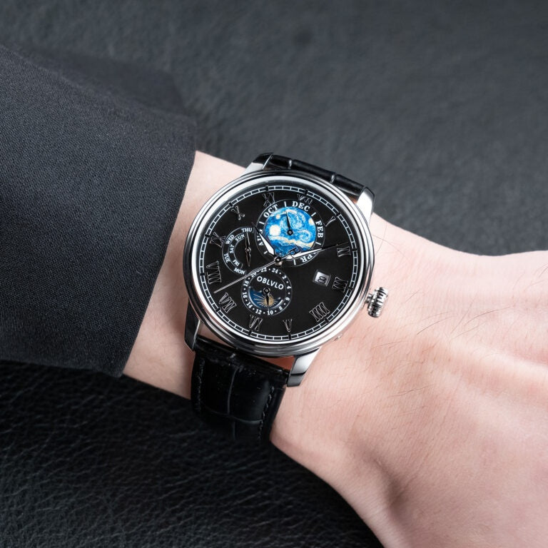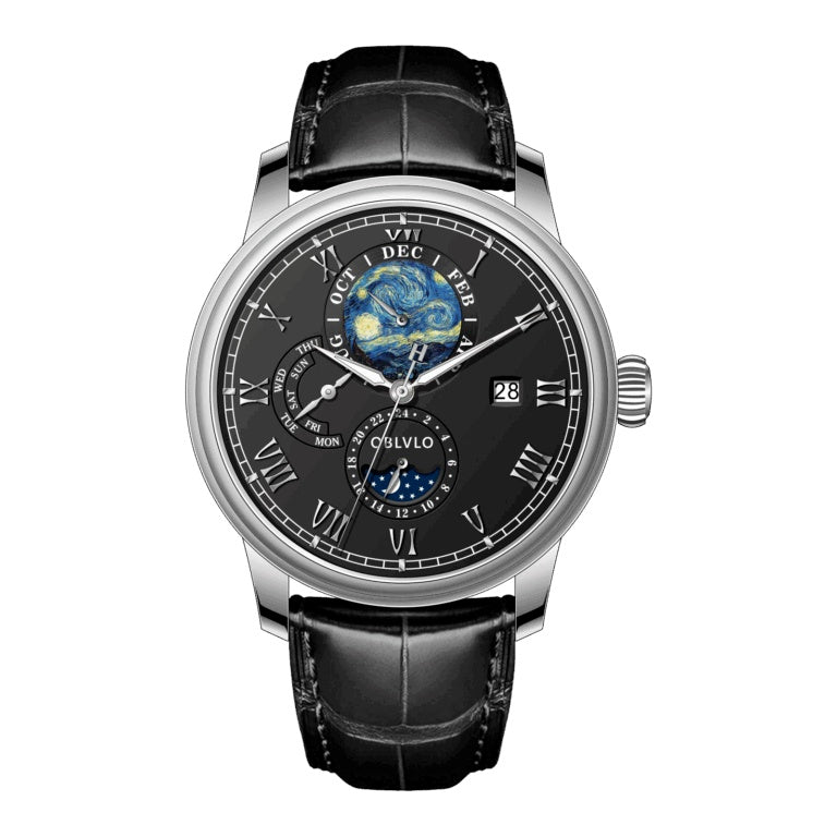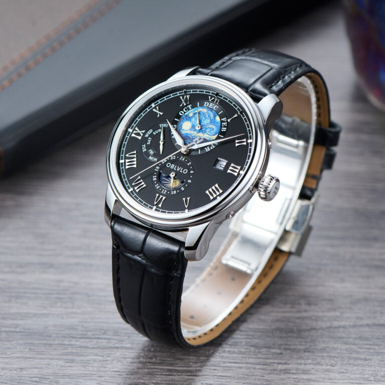 | This sophisticated OBLVLO timepiece exudes refined elegance with its polished silver case and deep black dial, creating a striking visual contrast. Roman numeral markers and meticulously crafted subdials showcase a perfect balance of classical design and modern complexity. At its heart lies the reliable 1653 Automatic movement, delivering seamless accuracy and effortless mechanical performance. The celestial moonphase and month display add an artistic touch, evoking the beauty of the night sky. Paired with a premium black leather strap, this watch stands as a true symbol of luxury, craftsmanship, and timeless style. |