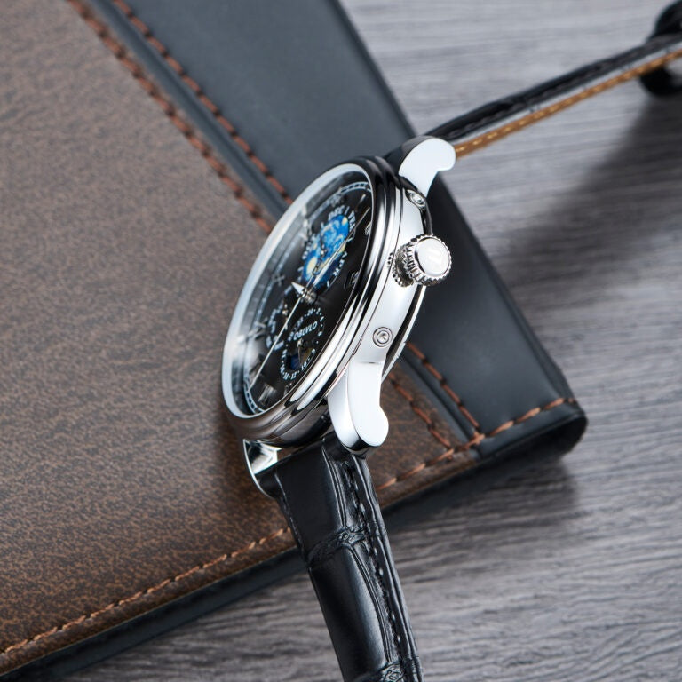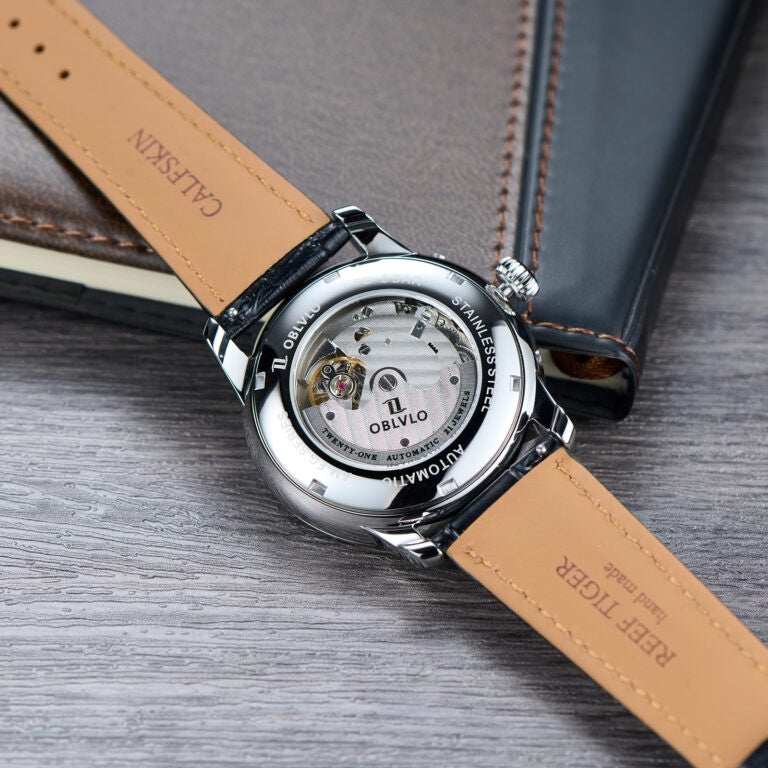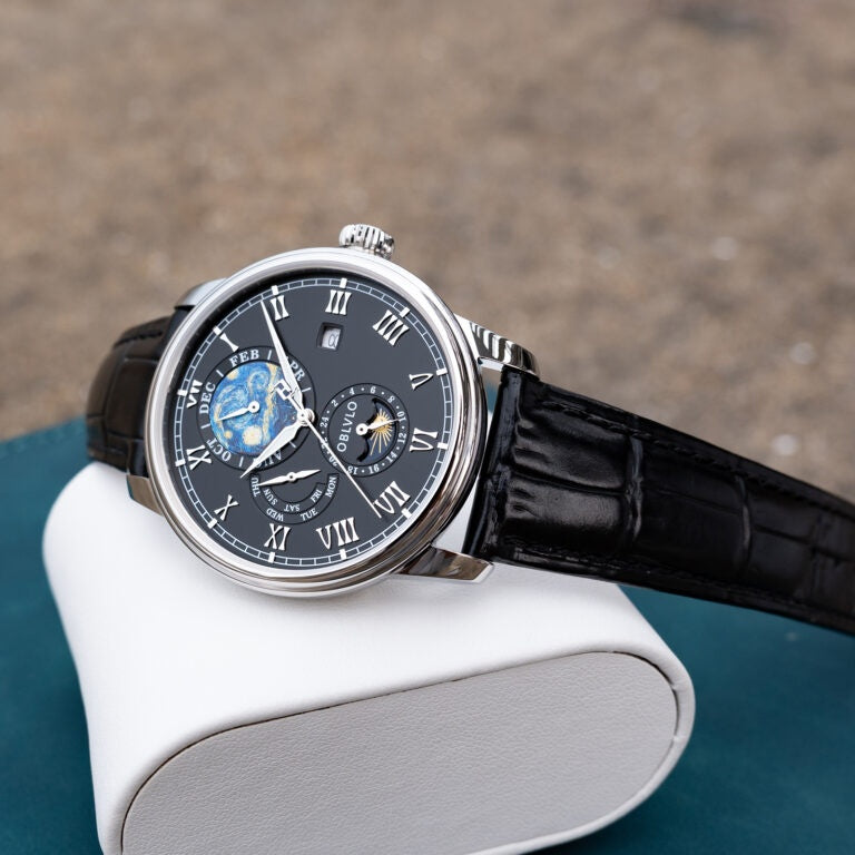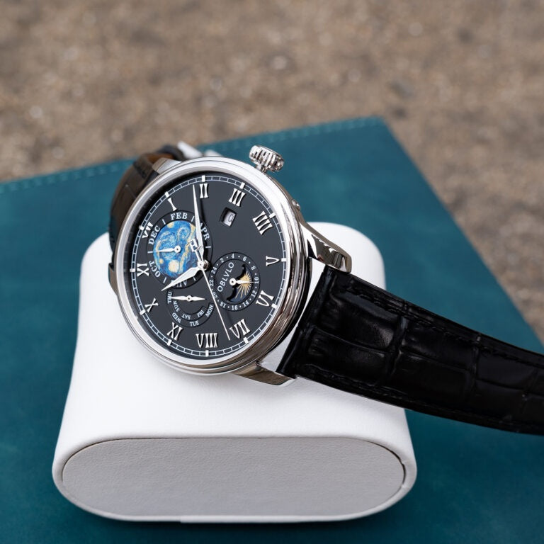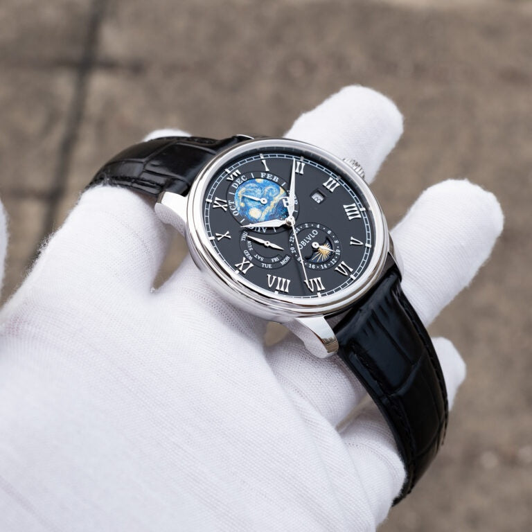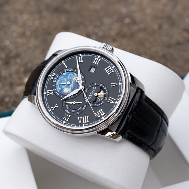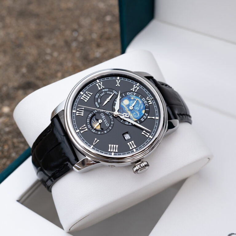 | This sophisticated OBLVLO timepiece exudes refined elegance with its polished silver case and deep black dial, creating a striking visual contrast. Roman numeral markers and meticulously crafted subdials showcase a perfect balance of classical design and modern complexity. At its heart lies the reliable 1653 Automatic movement, delivering seamless accuracy and effortless mechanical performance. The celestial moonphase and month display add an artistic touch, evoking the beauty of the night sky. Paired with a premium black leather strap, this watch stands as a true symbol of luxury, craftsmanship, and timeless style. |