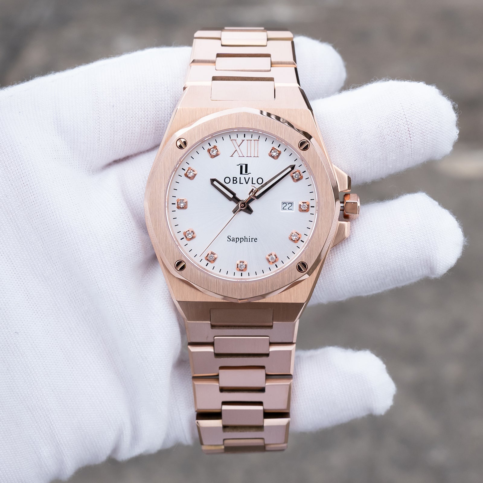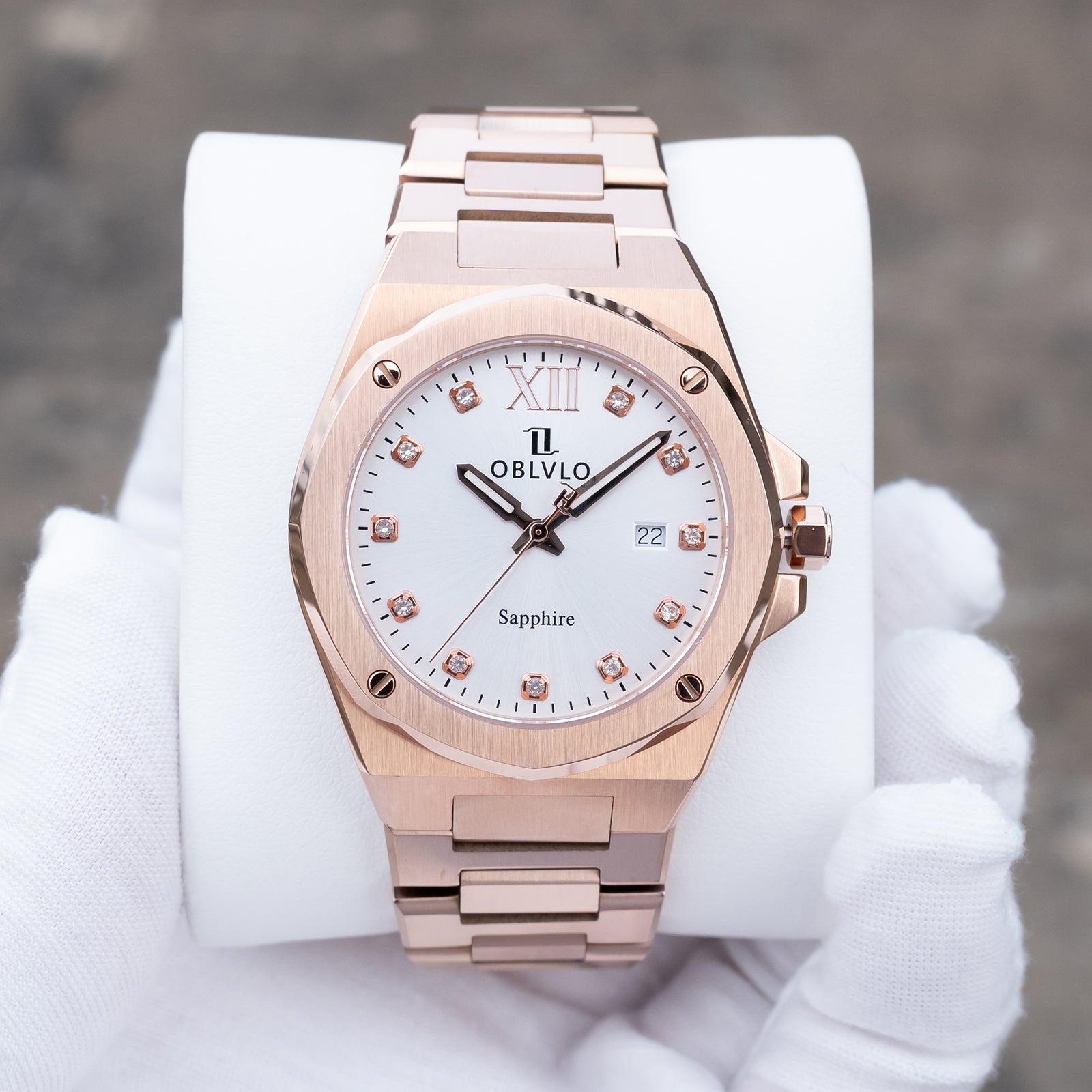 | OBLVLO is a statement of refined masculinity, crafted for the man who values precision, presence, and prestige. Designed in an elegant rose-gold tone with a seamlessly integrated bracelet, this timepiece reflects strength through its bold geometric case and polished detailing. The sunray dial shimmers subtly under light, enhanced by crystal hour markers and classic Roman numerals that evoke timeless sophistication. A sapphire finish protects its brilliance, while the date display adds practical excellence to its aesthetic charm. Every angle of the OBLVLO men’s watch speaks of luxury, confidence, and modern heritage — a masterpiece created not just to tell time, but to define it. |