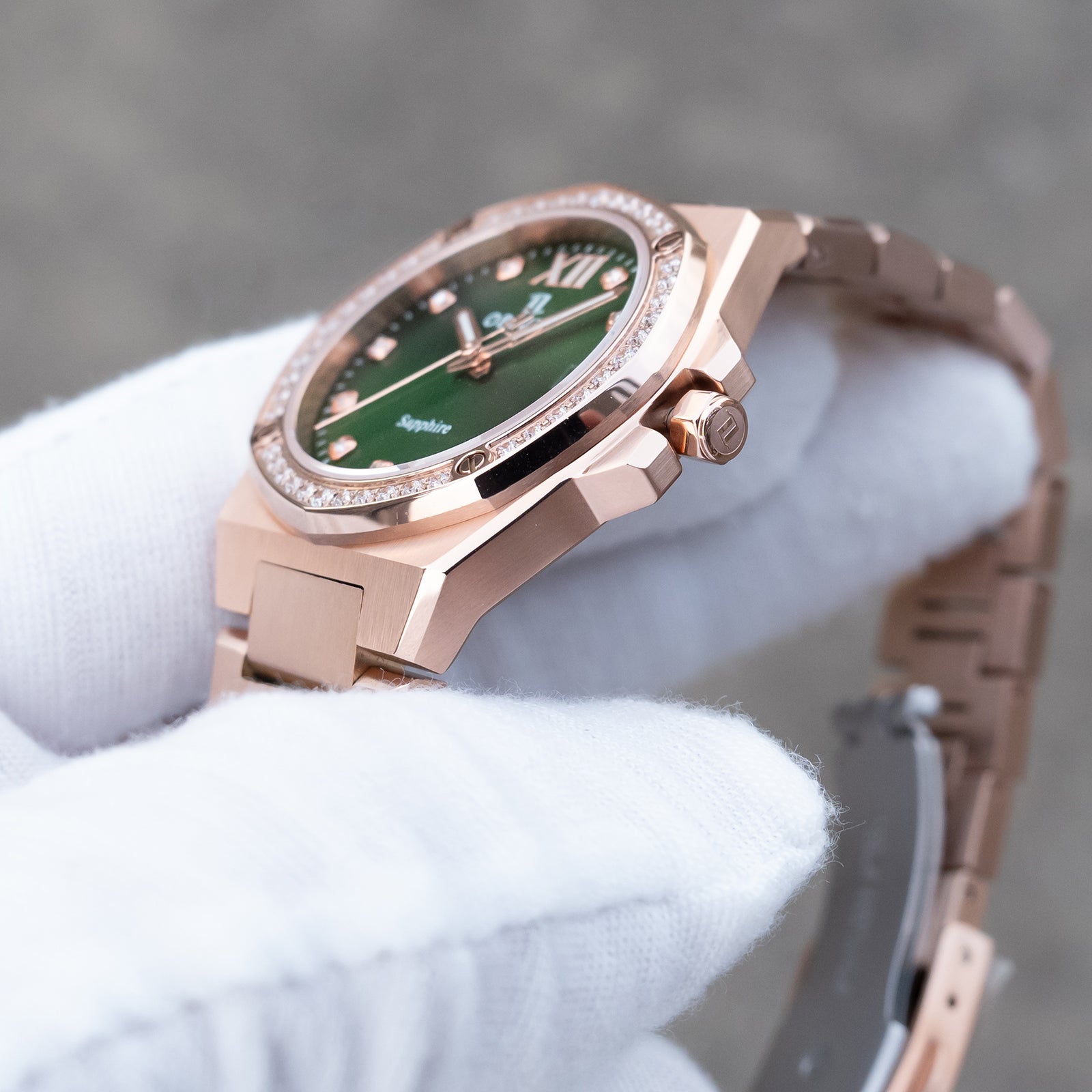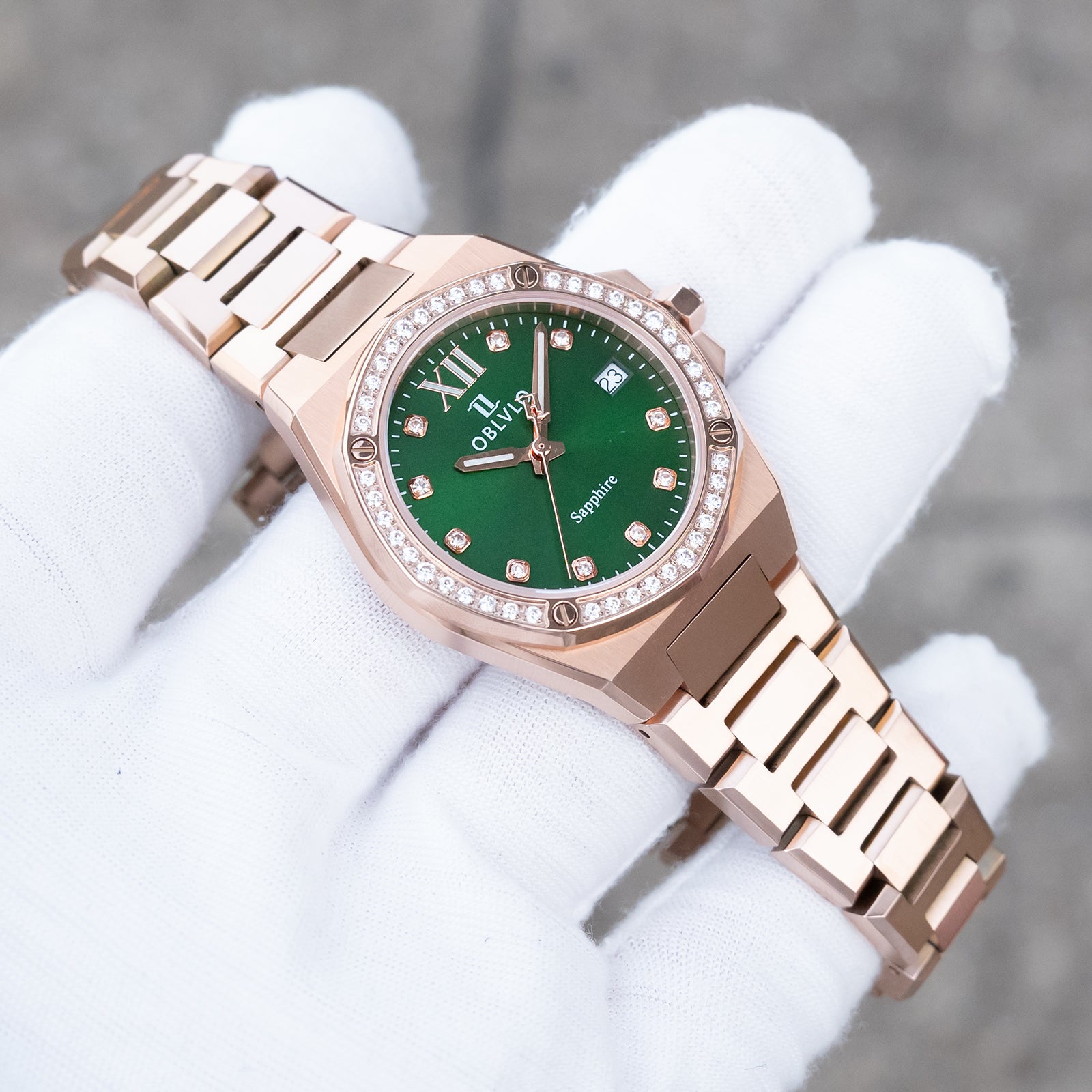 | The OBLVLO Women’s Luxury Watch is a radiant expression of elegance and refined craftsmanship. Designed for the modern woman who appreciates timeless beauty, this exquisite timepiece features a rich emerald green sunburst dial that captures the light with every movement. Brilliant crystal hour markers and a diamond-studded bezel frame the dial with captivating sparkle, while the Roman numeral at XII adds a touch of classic sophistication. The warm rose-gold toned case and integrated bracelet create a seamless silhouette, offering both strength and grace in every detail. A convenient date display enhances functionality without compromising style, and the sapphire crystal ensures lasting clarity and durability. The OBLVLO women’s watch is more than an accessory — it is a statement of confidence, luxury, and impeccable taste. |