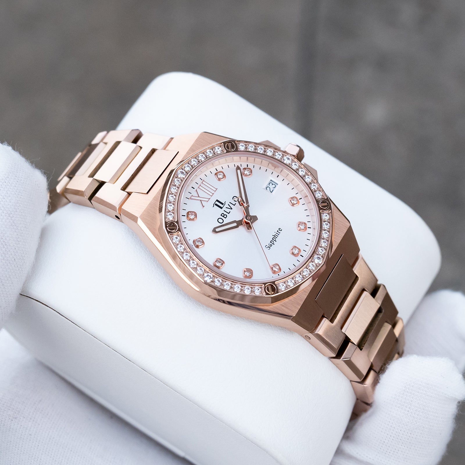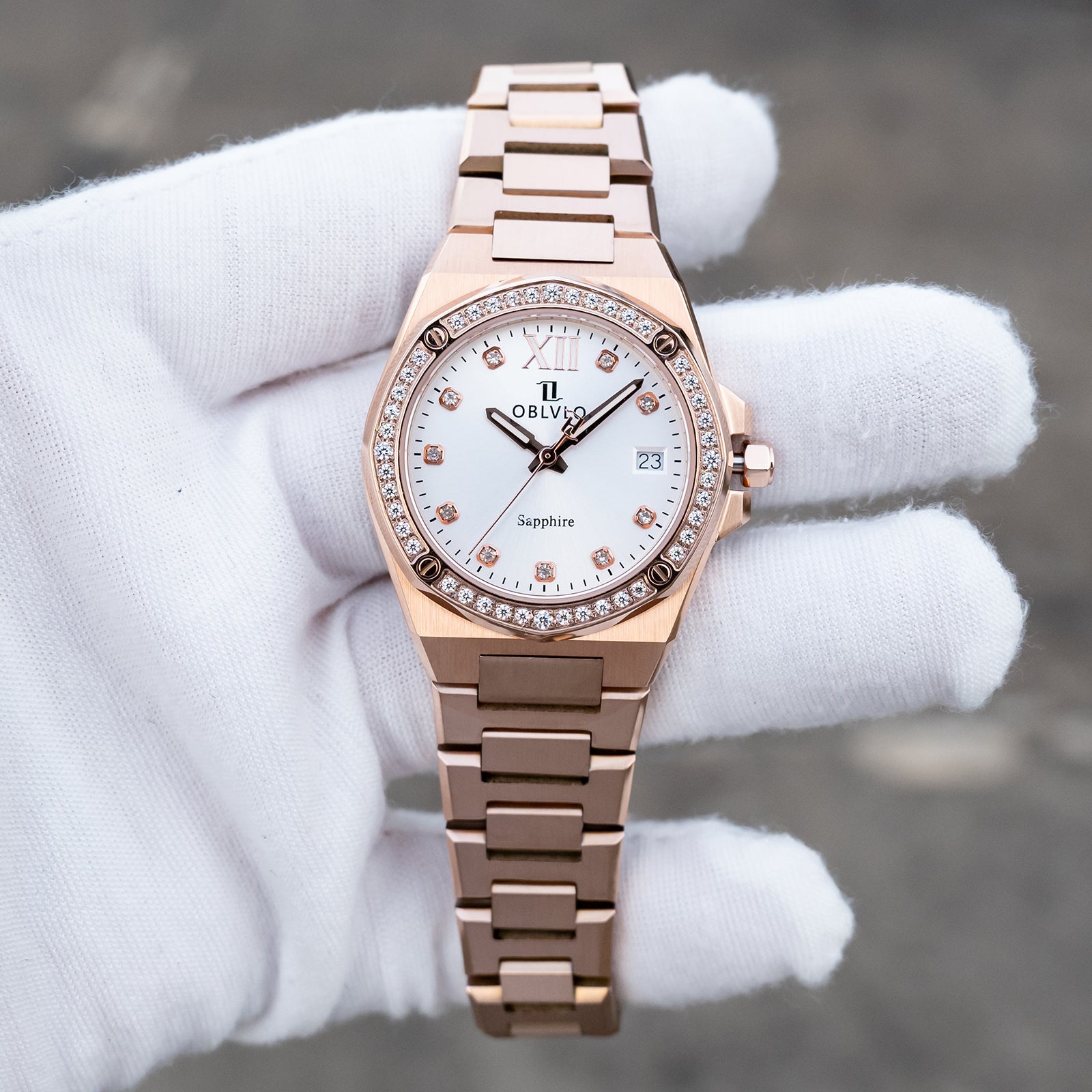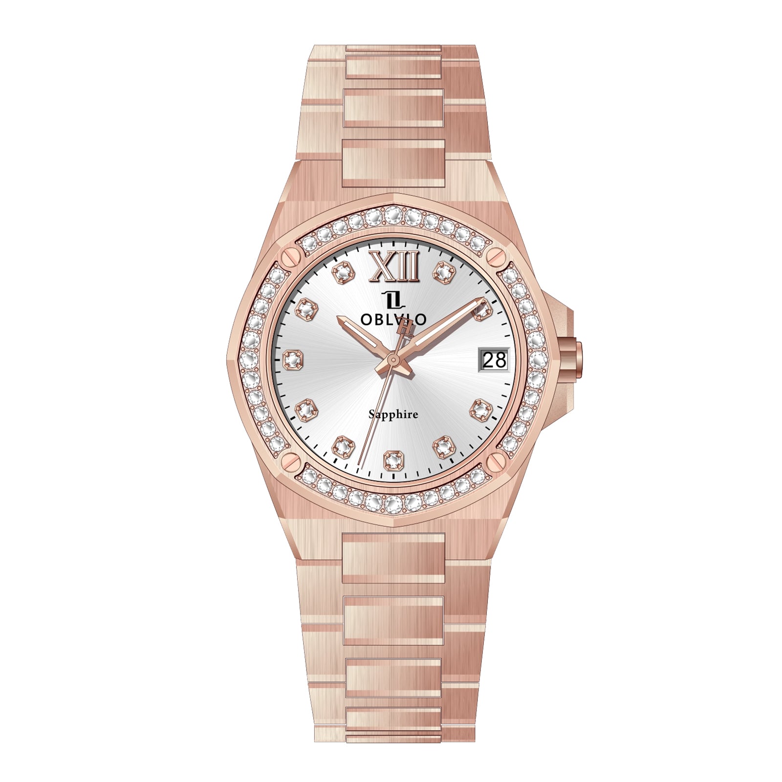 | The OBLVLO women’s watch is a radiant expression of elegance, crafted in a stunning rose-gold tone that exudes timeless luxury. Its refined dial is adorned with sparkling crystal hour markers and a diamond-set bezel, creating a captivating shimmer with every movement. The sleek integrated bracelet enhances its modern silhouette while offering exceptional comfort and sophistication. A sapphire crystal finish ensures lasting brilliance and durability, reflecting the brand’s commitment to premium craftsmanship. Designed for the woman who appreciates grace and glamour, this OBLVLO timepiece is the perfect blend of fashion and finesse. |