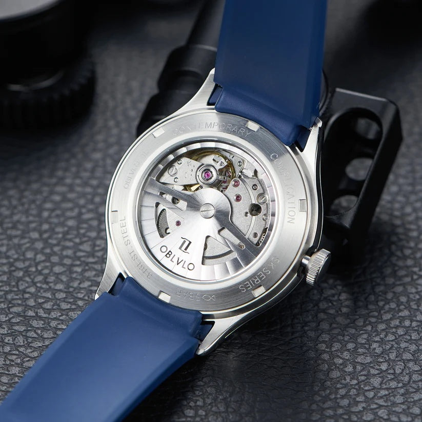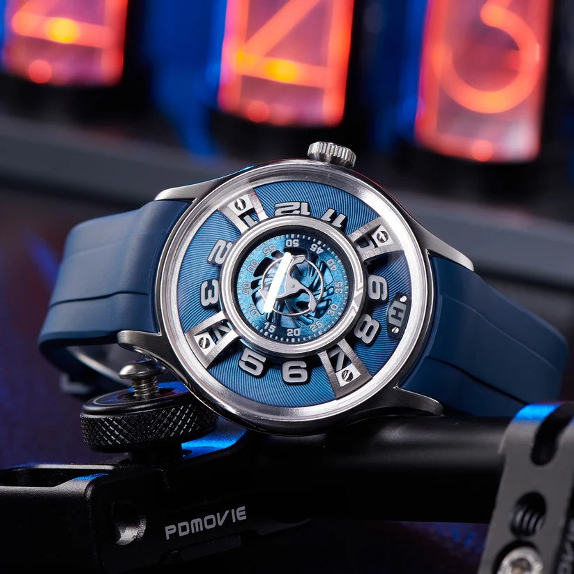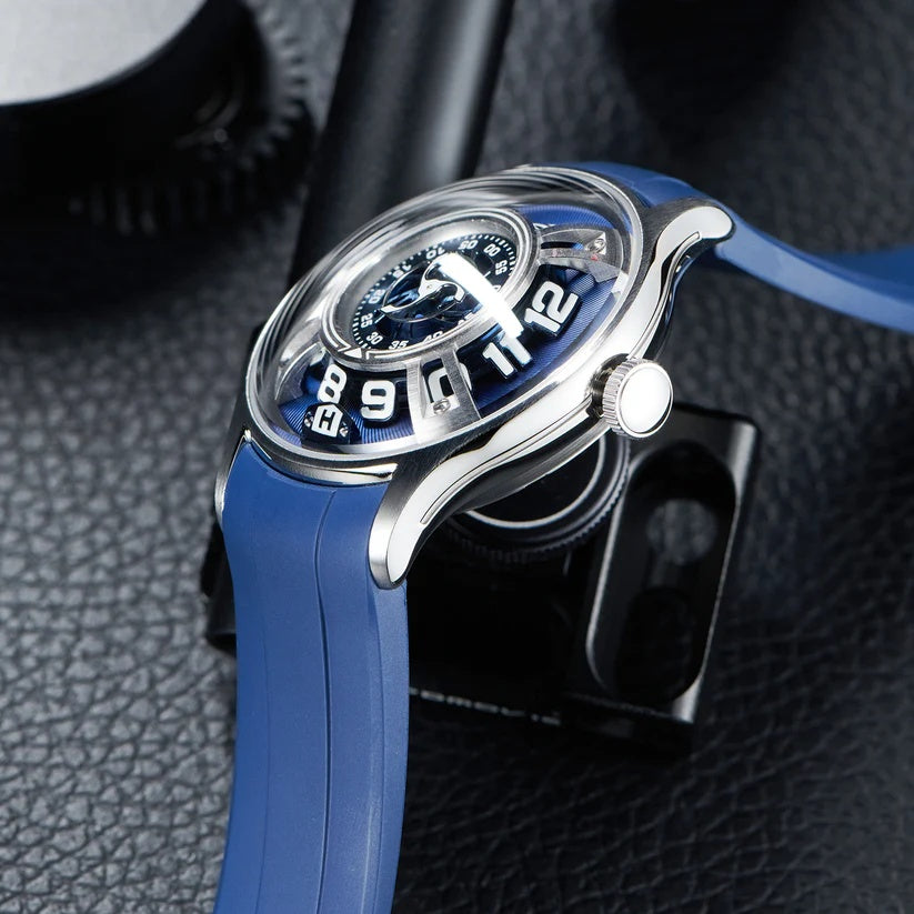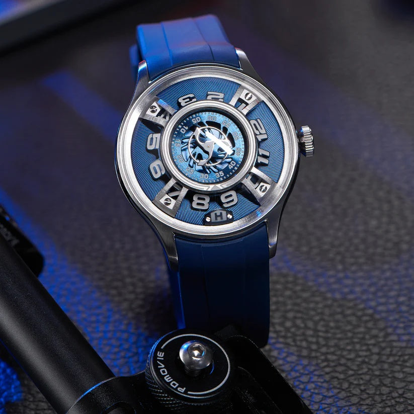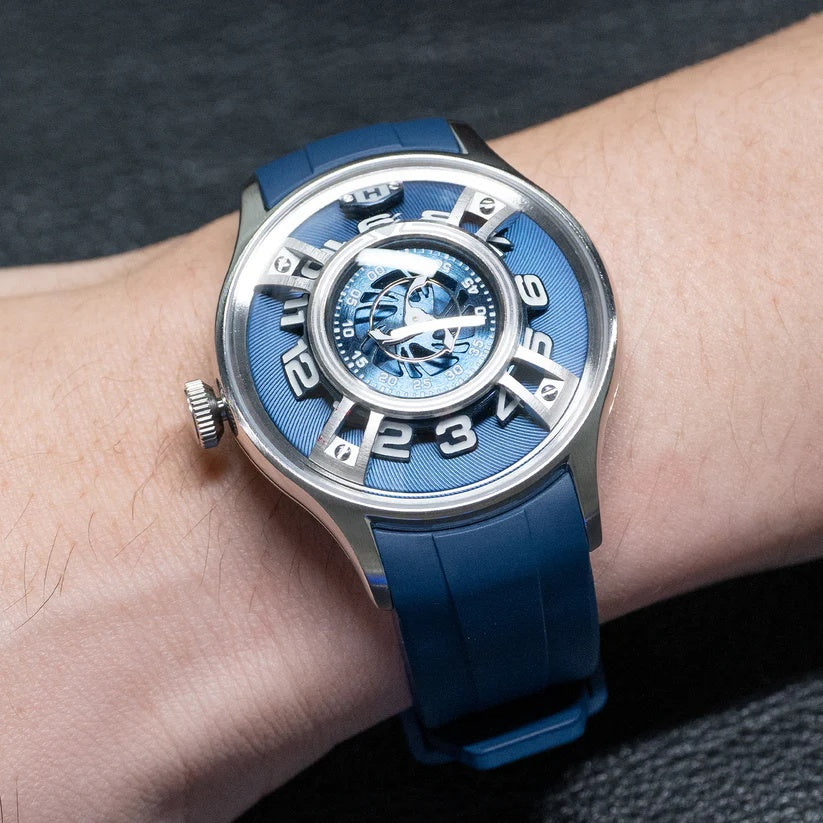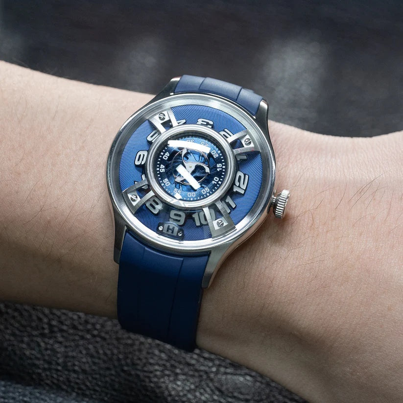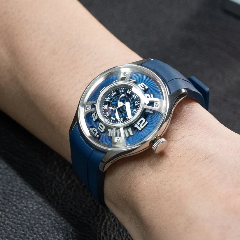 | This bold and futuristic timepiece, known for its innovative hydro-mechanical technology. The watch features a unique fluid-based display that uses two bellows to move colored and clear liquids around the dial to indicate the hours. It combines advanced engineering with a visually striking design, including a blue dial with a metallic finish. The central minute display is nested within a circular scale, while the seconds are displayed via a turbine-like indicator. Its titanium case adds a modern, industrial flair and provides lightweight durability. The blue rubber strap enhances its sporty, contemporary aesthetic. The crown on the side is used to wind and set the watch, merging traditional mechanics with futuristic design. It is a conversation piece that stands out in any luxury watch collection. |