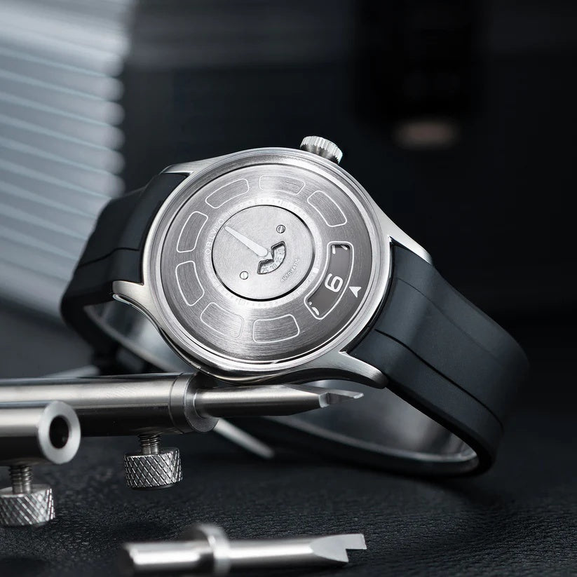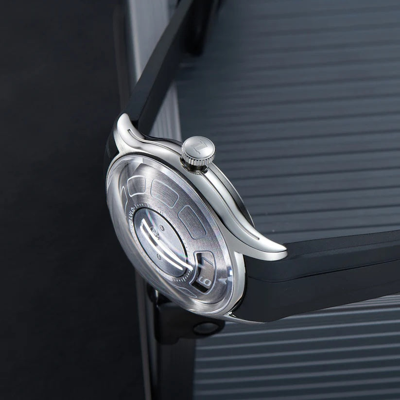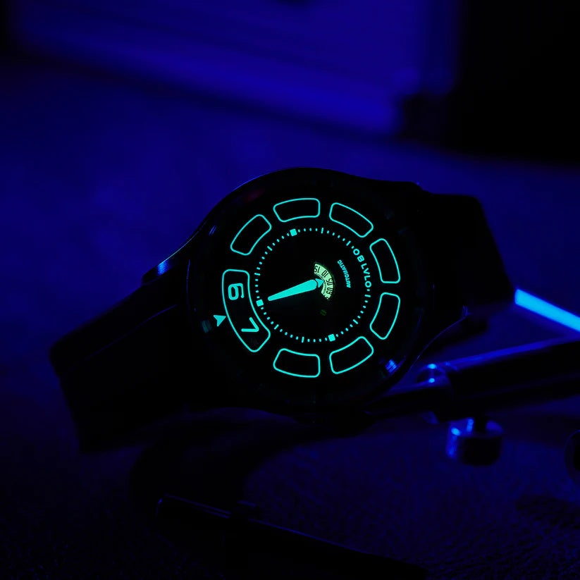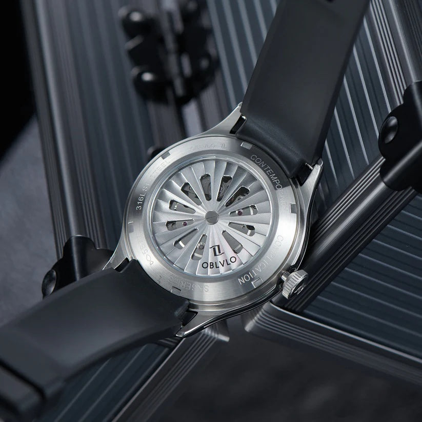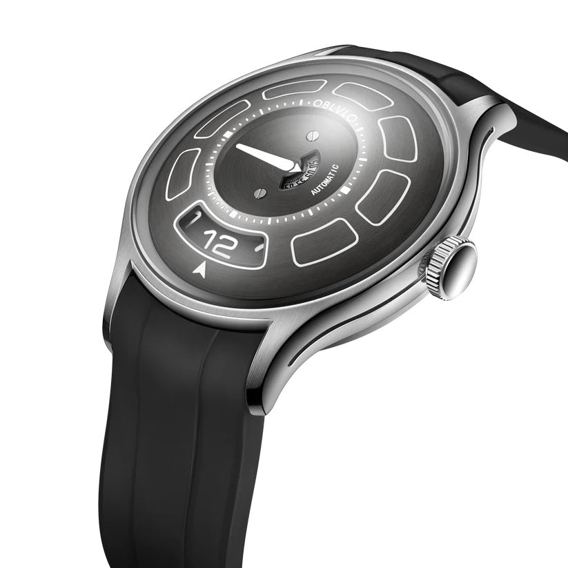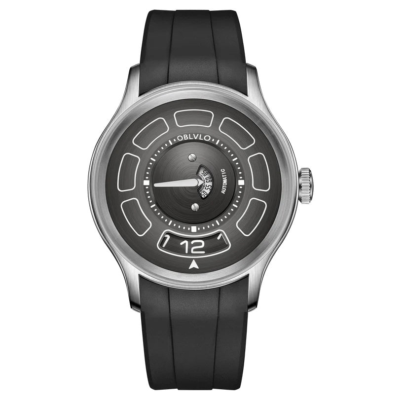 | The watch in the image is a modern, bold timepiece that stands out with its unique dial design and minimalist aesthetic. Branded “OBLVLO,†it features a brushed metallic dial with a central rotating disc indicating the time through a semi-circular window, rather than traditional hands. The hour is displayed digitally at the 6 o'clock position, while the minute is shown through a rotating central gauge, offering a sleek and unconventional approach to timekeeping. Its stainless steel case adds a refined yet industrial appeal, paired with a durable black rubber strap for a sporty edge. The design is clean, futuristic, and aimed at wearers who appreciate innovation in horology. Markers are embedded within recessed segments around the dial, enhancing readability and adding depth. The watch is automatic, as indicated on the dial, showcasing mechanical craftsmanship beneath its modern face. A single crown on the right side allows manual adjustments. Overall, this watch merges style, functionality, and a fresh interpretation of time display. |