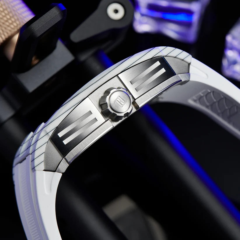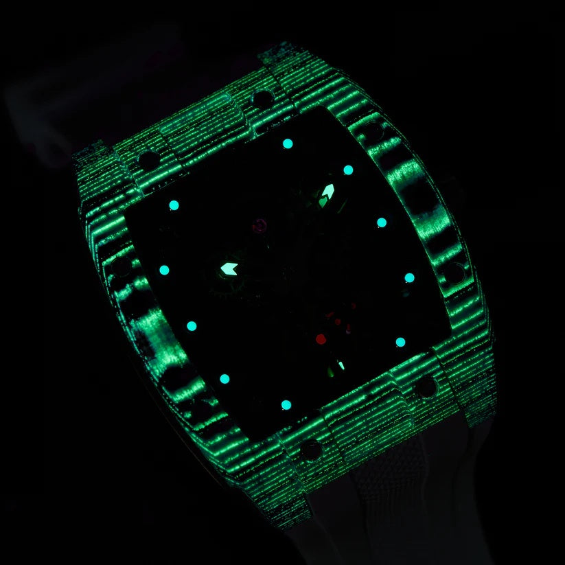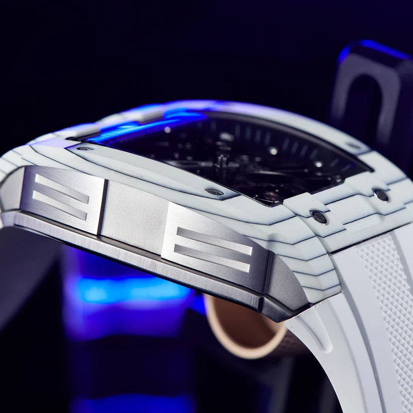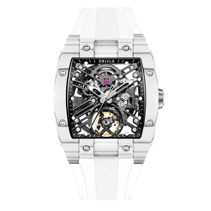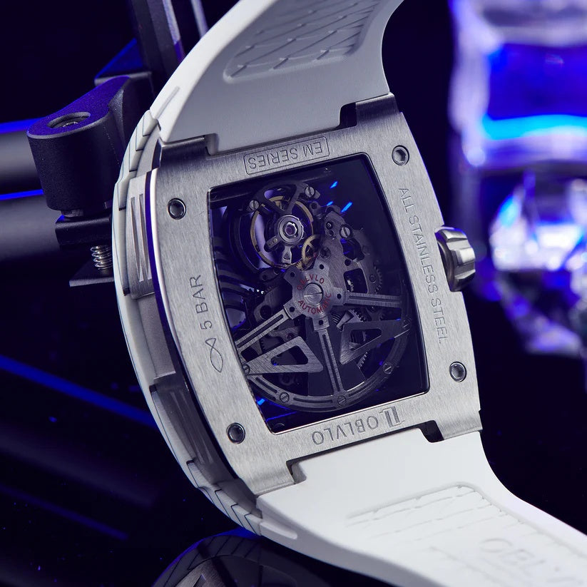 EM-ST-SBWW is a model number for an OBLVLO watch, specifically the "Luxury White LumiNova Carbon Fiber Skeleton Automatic Watch". It is available for purchase at Labdhi Watches & Premium