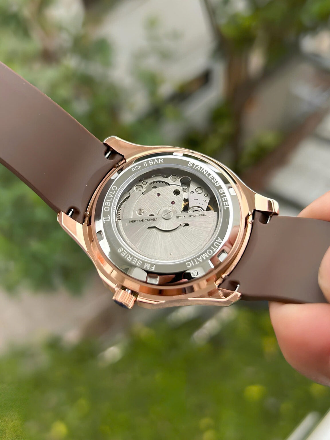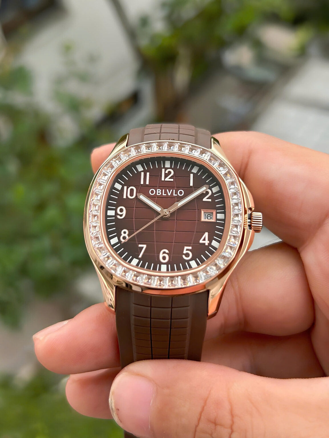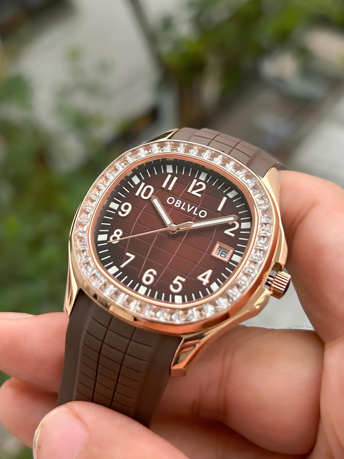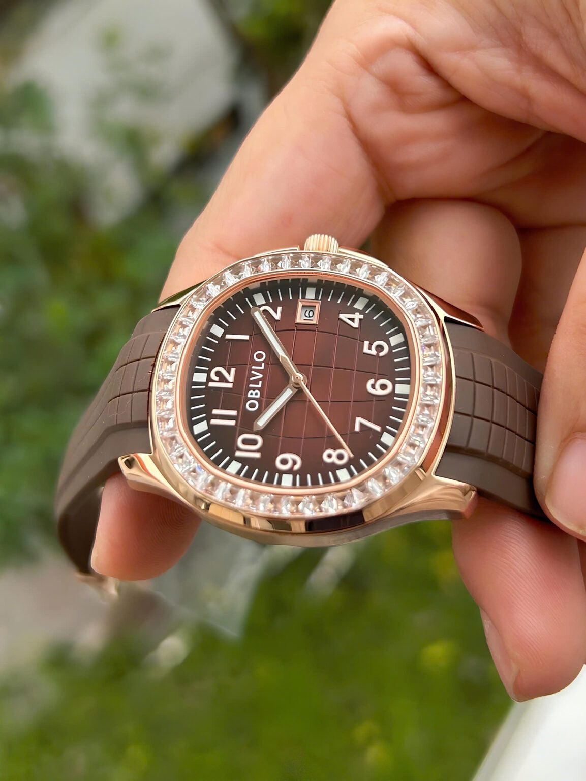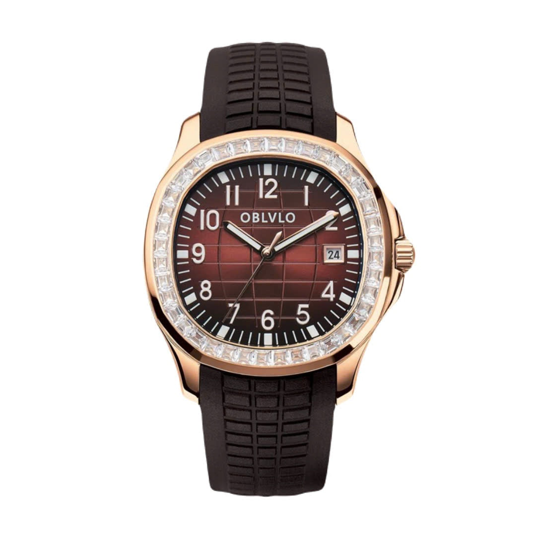 | This luxurious timepiece from OBLVLO epitomizes sophistication and style. Its rose gold case frames a stunning deep burgundy dial, enriched with a subtle checkered gradient that reflects light elegantly. The bezel is encrusted with radiant baguette-cut stones, adding a dazzling brilliance that enhances its premium allure. Sleek silver-toned numerals and luminous hands ensure optimal legibility while elevating its refined aesthetic. A practical date window is positioned neatly at 3 o’clock, combining form with function. The robust black rubber strap contrasts beautifully with the gold case, offering both comfort and a modern touch. Engineered for precision, it houses a high-quality movement that ensures accurate timekeeping. This watch seamlessly blends contemporary design with timeless elegance. Ideal for discerning individuals, it serves as a statement of taste and success. Whether worn for formal occasions or daily sophistication, this OBLVLO watch is a true mark of luxury. |