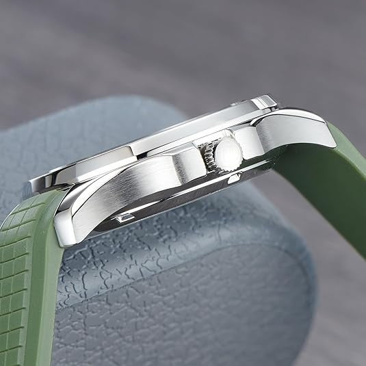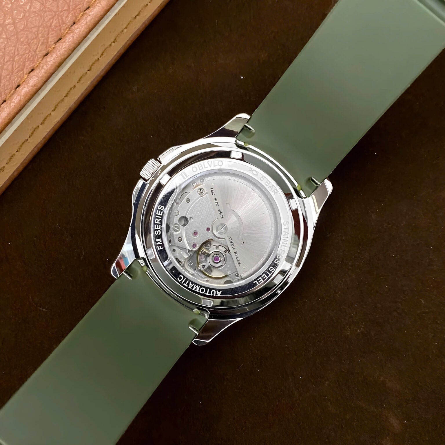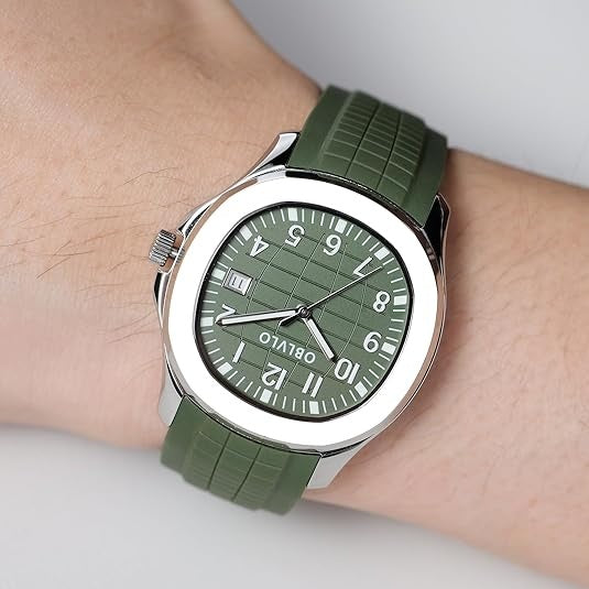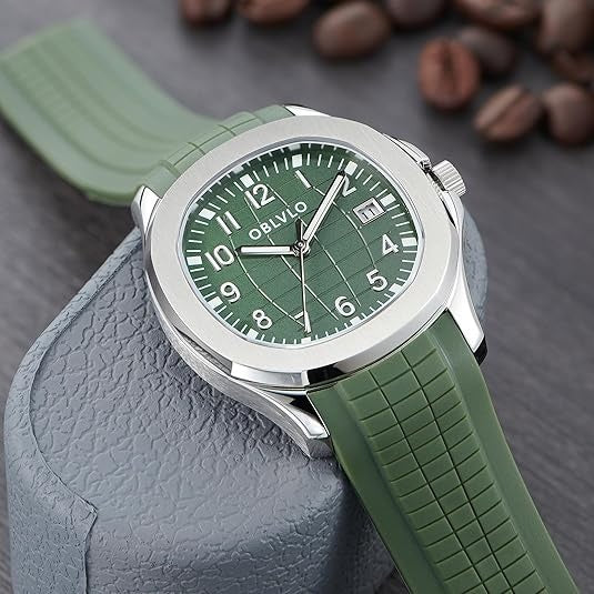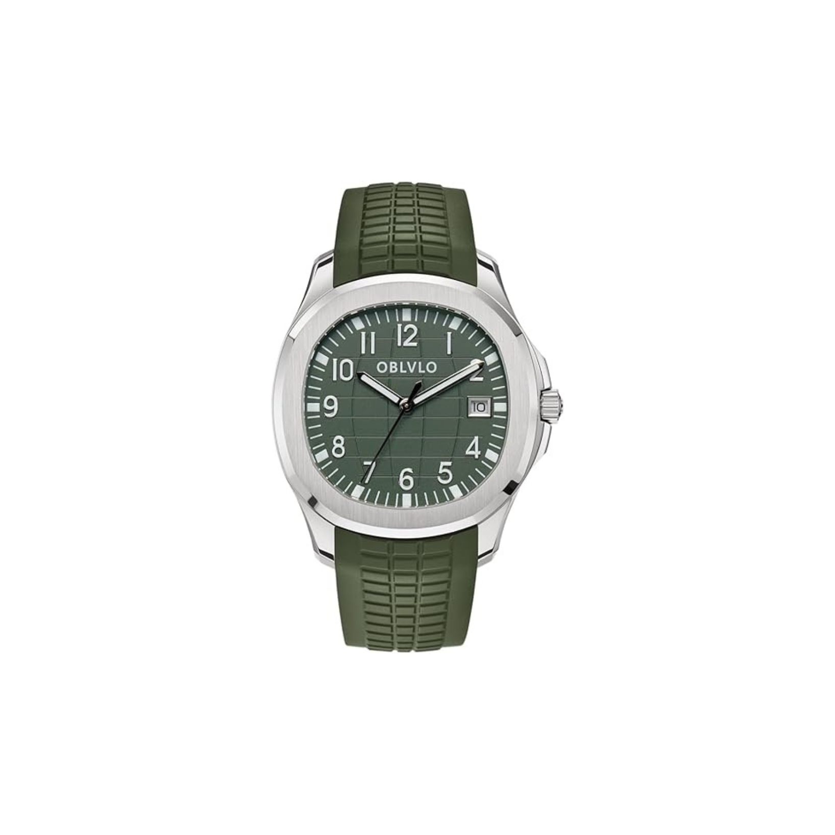 | The OBLVLO luxury watch showcased in the image is a stunning blend of modern aesthetics and classic craftsmanship. Featuring a bold olive green dial with a grid-textured pattern, it exudes a rugged yet refined charm. The watch case is crafted from high-quality stainless steel, providing a sleek, brushed finish that complements the overall look. Prominent white numerals and luminous hands enhance readability while adding a touch of sophistication. A date window positioned at 3 o’clock adds both utility and elegance. The olive green rubber strap features a unique textured design, ensuring both comfort and durability. Its secure clasp offers a snug, reliable fit for daily wear or upscale outings. The watch combines form and function seamlessly, offering water resistance and precision timekeeping. Whether worn with casual attire or formal wear, this timepiece is a bold statement of taste. OBLVLO's attention to detail makes this watch an ideal choice for those who appreciate luxury with a sporty edge. |