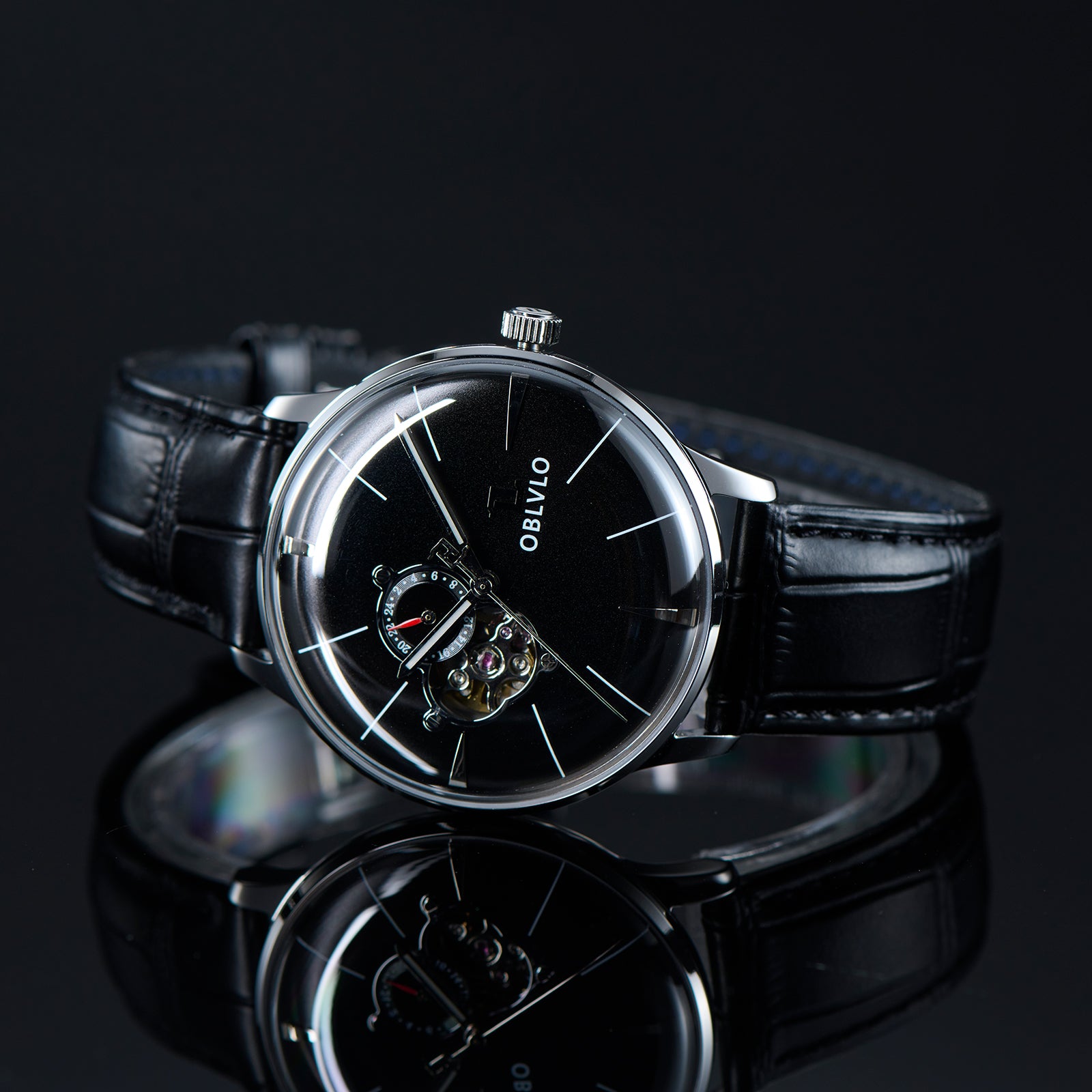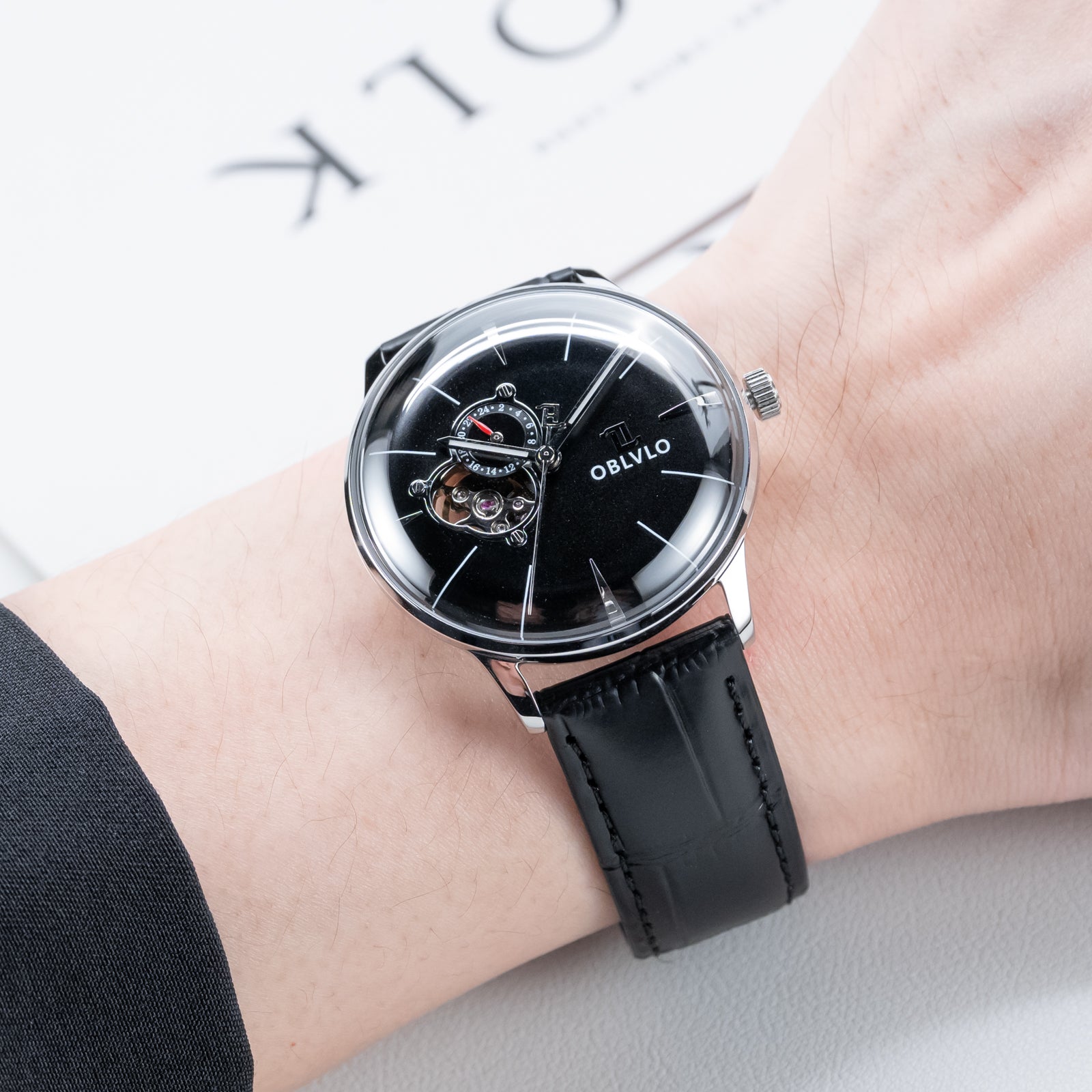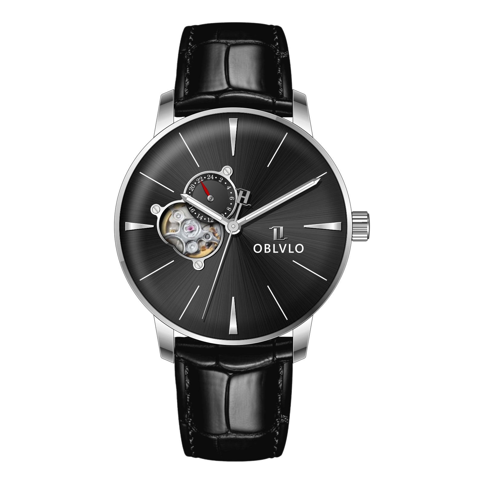 This OBLVLO masterpiece exudes an aura of refined luxury and timeless sophistication. Crafted with a meticulously polished stainless steel case and an intricately woven multilink bracelet it radiates elegance at every angle. The captivating black sunburst dial shimmers under the light creating a sense of depth and prestige reserved for truly distinguished timepieces. At the 9 o clock position the openheart complication offers a mesmerizing view of the beating NH39 automatic movement a symbol of precision engineering and horological artistry. The 24hour subdial adds a touch of complexit