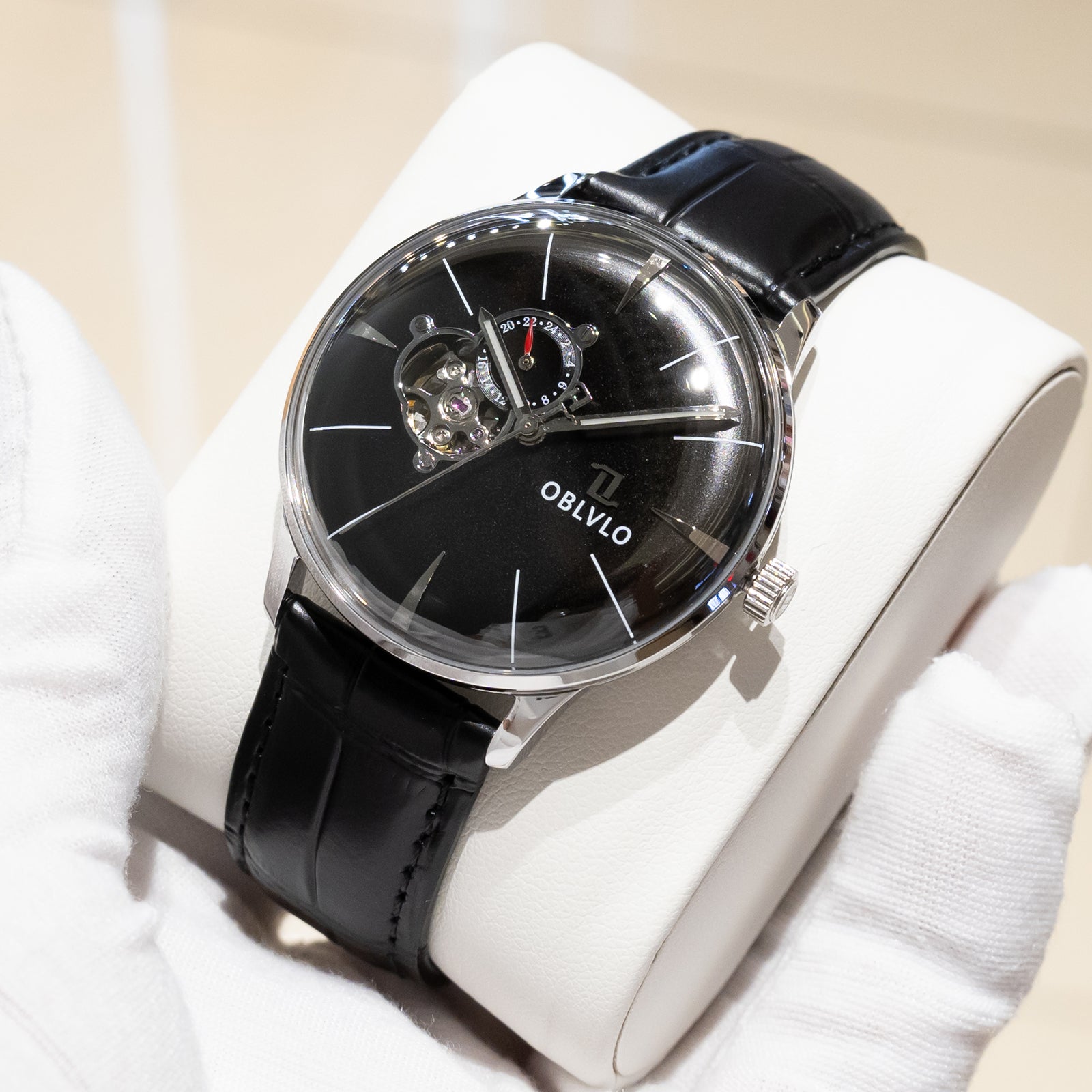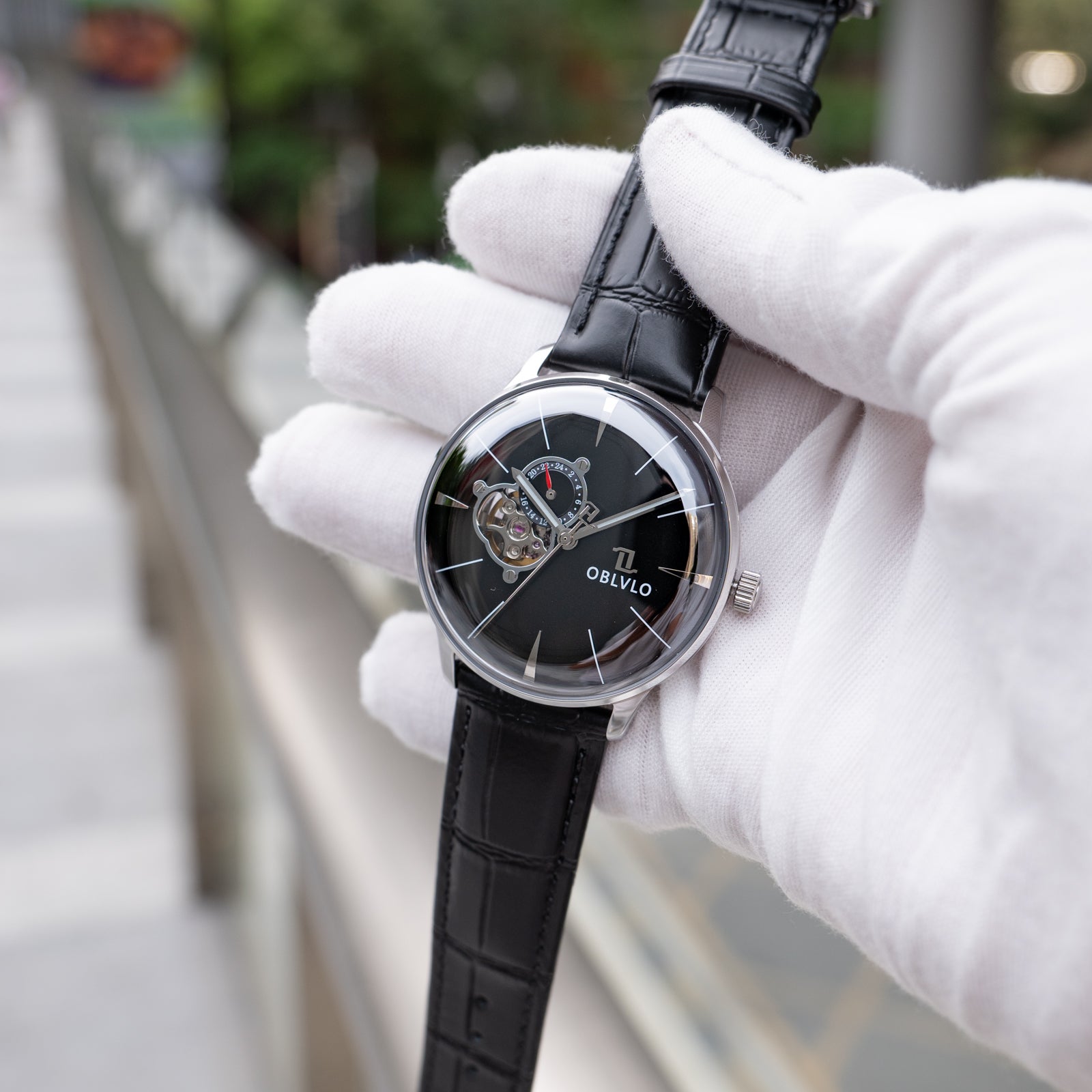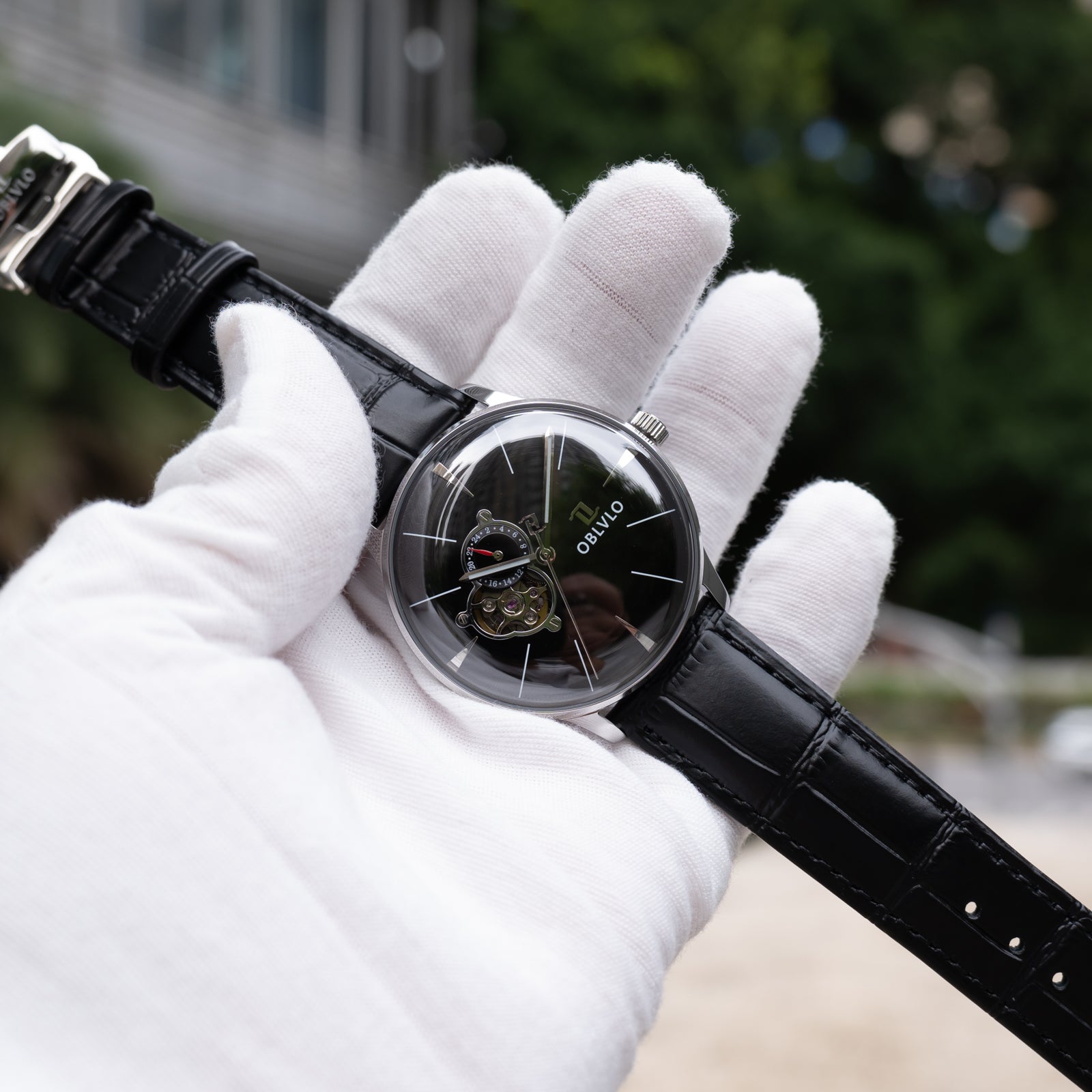 This OBLVLO masterpiece exudes an aura of refined luxury and timeless sophistication. Crafted with a meticulously polished stainless steel case and an intricately woven multilink bracelet it radiates elegance at every angle. The captivating black sunburst dial shimmers under the light creating a sense of depth and prestige reserved for truly distinguished timepieces. At the 9 o clock position the openheart complication offers a mesmerizing view of the beating NH39 automatic movement a symbol of precision engineering and horological artistry. The 24hour subdial adds a touch of complexit