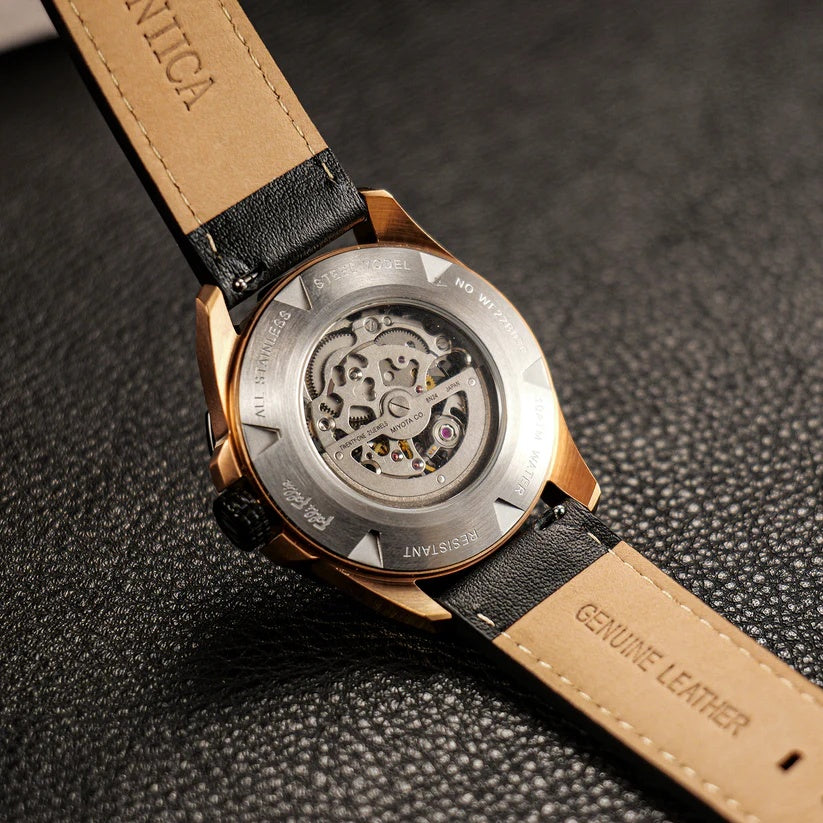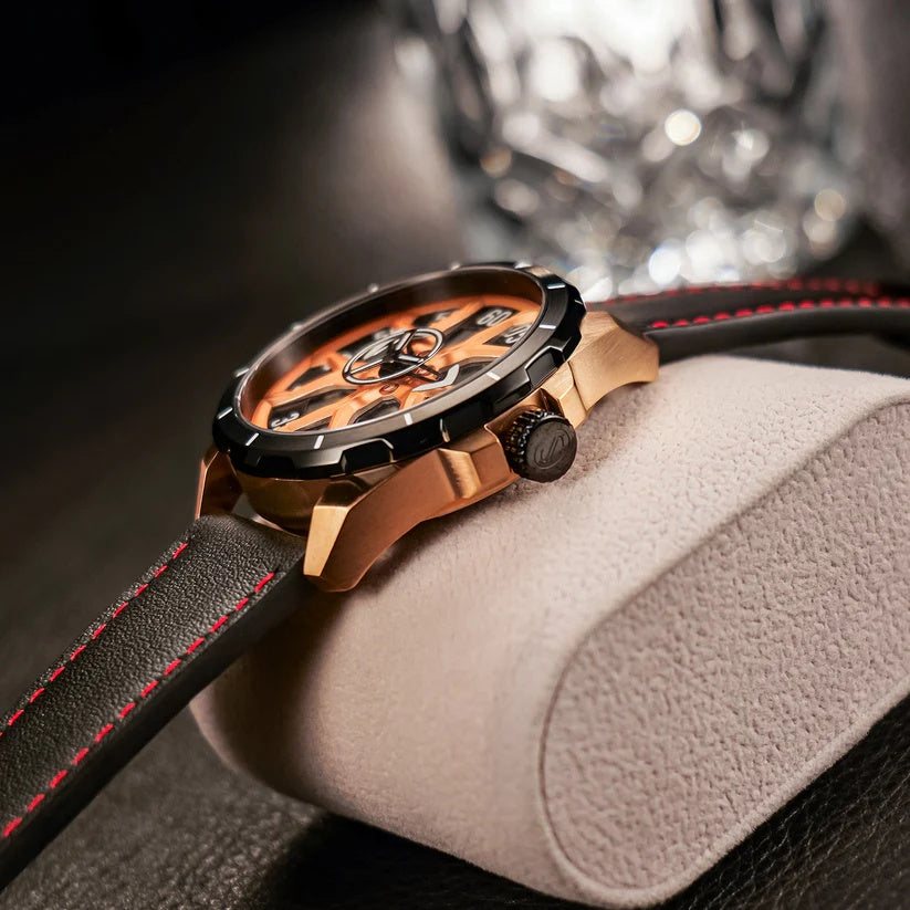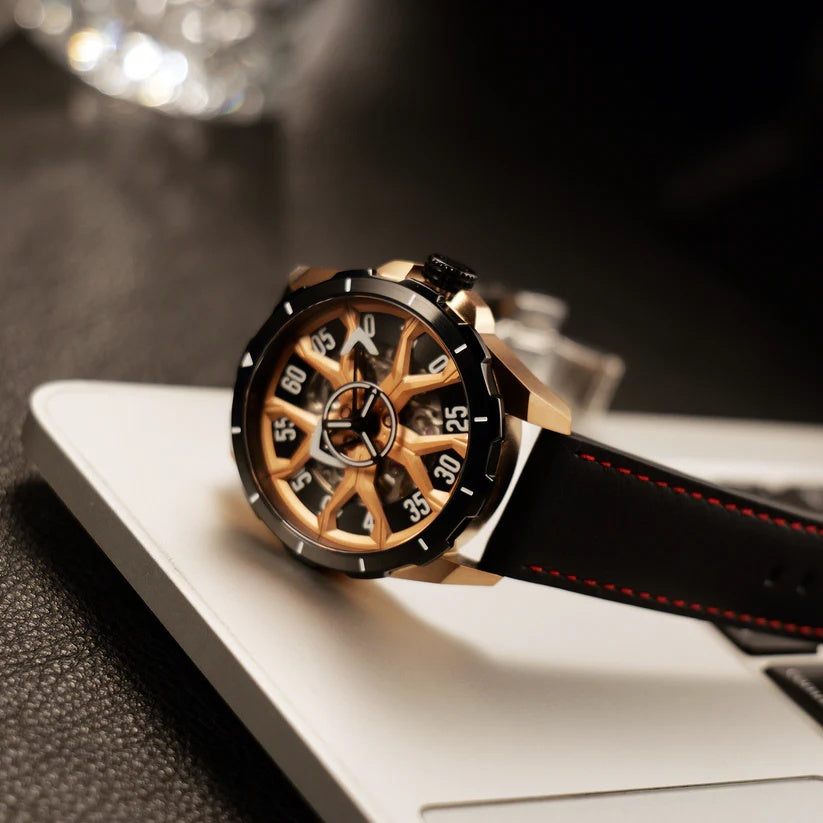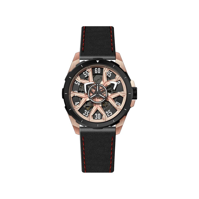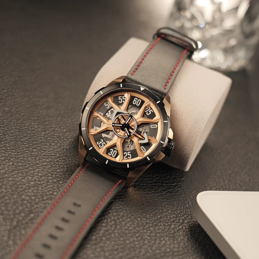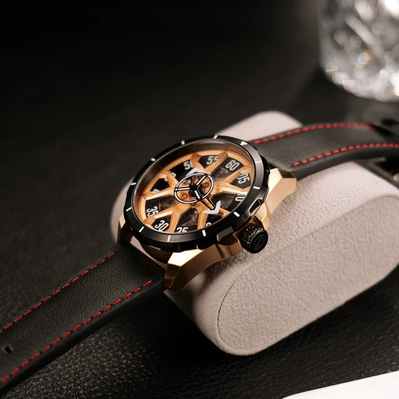| The OBLVLO timepiece commands attention with its bold skeletal design, revealing the artistry of its inner mechanics. Powered by the refined Miyota 8N24 Automatic movement, it delivers exceptional precision wrapped in undeniable sophistication. The striking rose-gold accents and angular architecture create a powerful statement of modern luxury. Its deep black strap with vivid red stitching adds a touch of sporty elegance, perfectly balancing refinement and edge. Crafted for those who demand presence and performance, this watch stands as a true symbol of elevated style. |