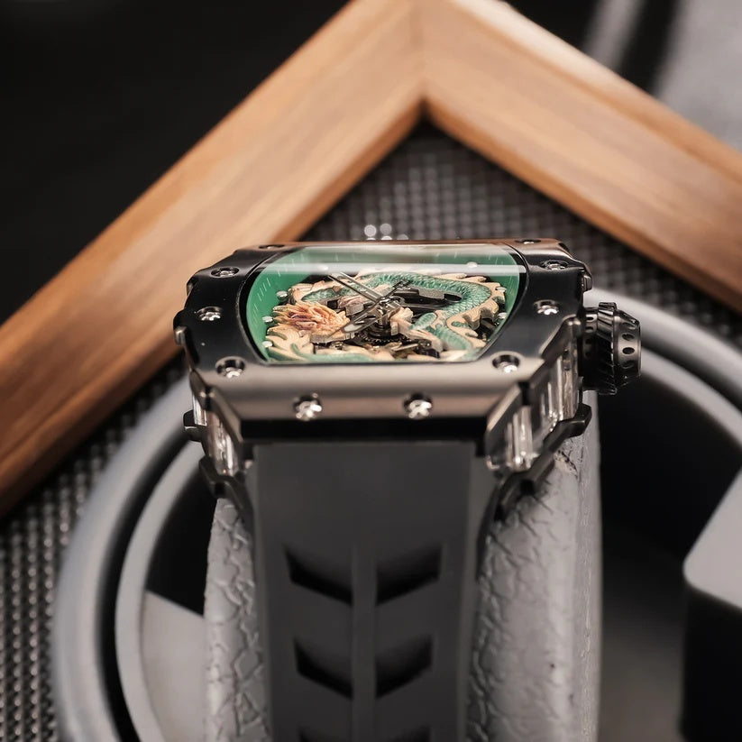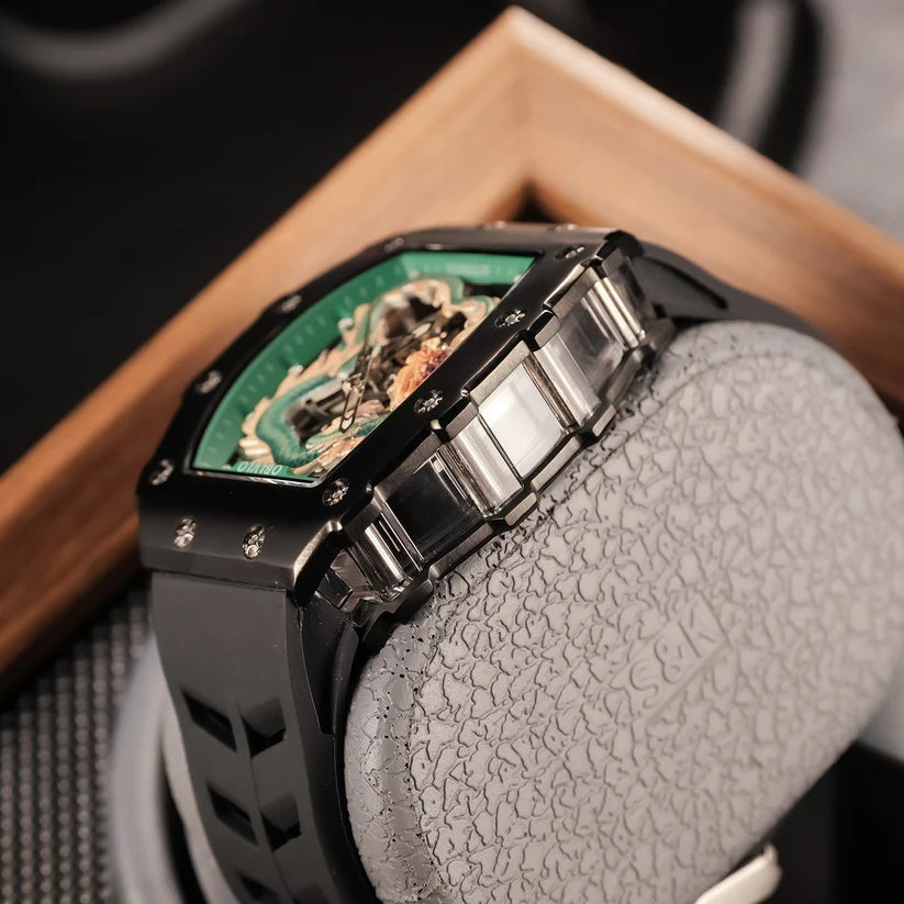 | The OBLVLO XM Dragon Series redefines luxury men’s watches with its impeccable craftsmanship and striking design. Featuring a distinctive tonneau-shaped case forged from premium 316L stainless steel with a sleek black PVD coating, these timepieces showcase a mesmerizing skeleton dial adorned with an intricate emerald-green Chinese dragon motif that exudes power and mystique. Powered by a precise automatic movement, the watch balances a commanding 43mm diameter and a slim 13.5mm profile for both presence and comfort. A durable black fluoro rubber strap with a polished tang buckle complements the sophisticated aesthetic, while a scratch-resistant sapphire crystal offers a clear view of the mechanical artistry within. With water resistance up to 50 meters, the OBLVLO XM Dragon Series flawlessly blends heritage-inspired design with modern innovation, making it a bold statement of exclusivity and timeless elegance for the discerning collector. | \n