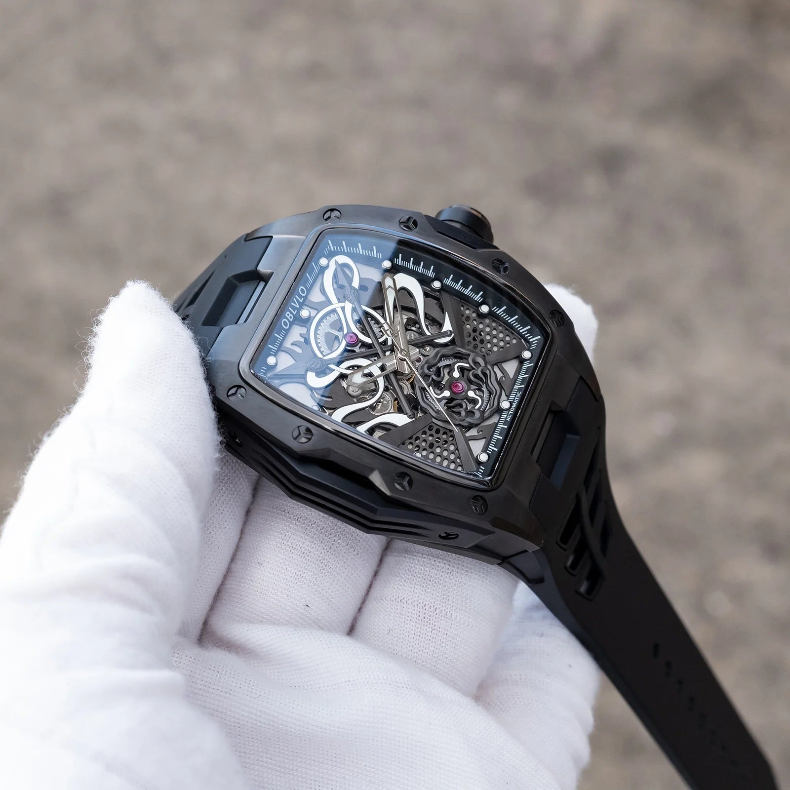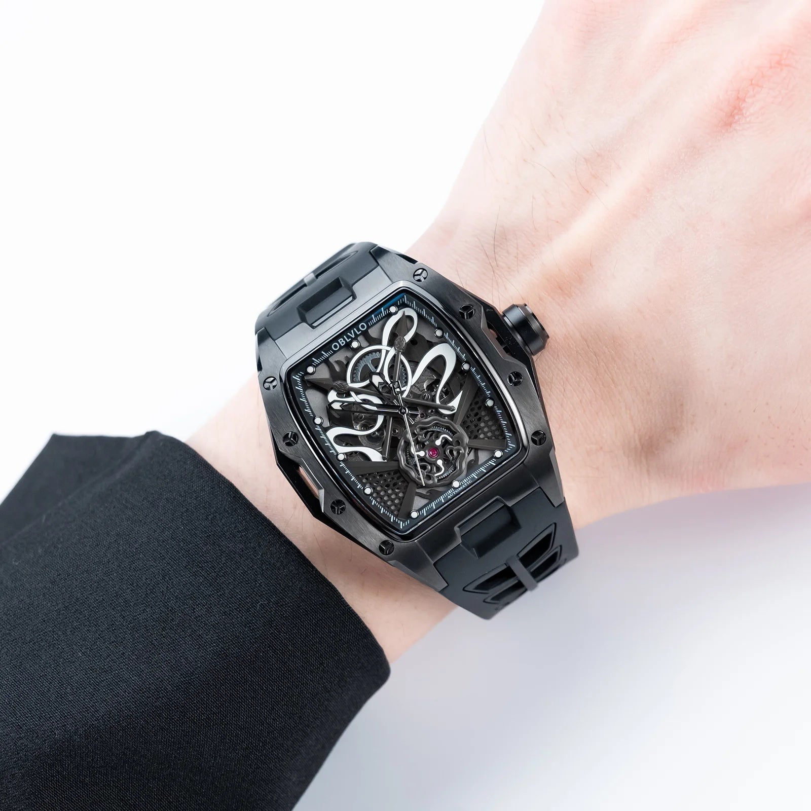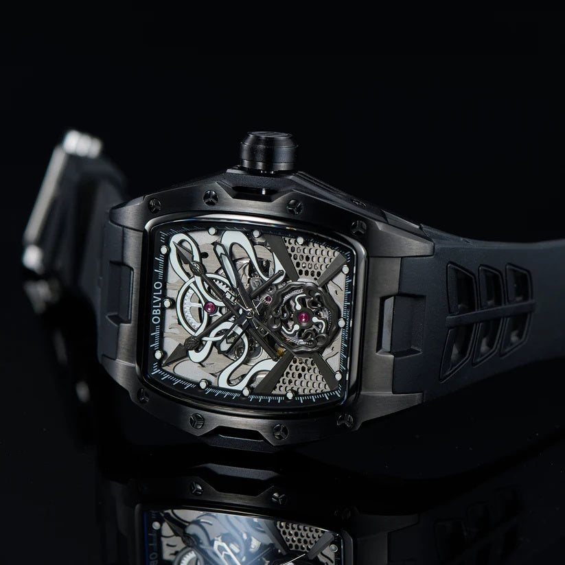 | OBLVLO elevates modern horology with this striking all-black timepiece, defined by its bold architecture and captivating skeletonized dial. At its heart beats the dependable Miyota 82S0 automatic movement, showcased through an intricate display of gears, curves, and mechanical artistry. The brushed black case and matching strap create a seamless, powerful silhouette that exudes contemporary luxury. Every detail—from the precision-cut framework to the luminous accents—reflects OBLVLO’s dedication to refined craftsmanship. This watch stands as a statement of sophistication, innovation, and commanding style. |