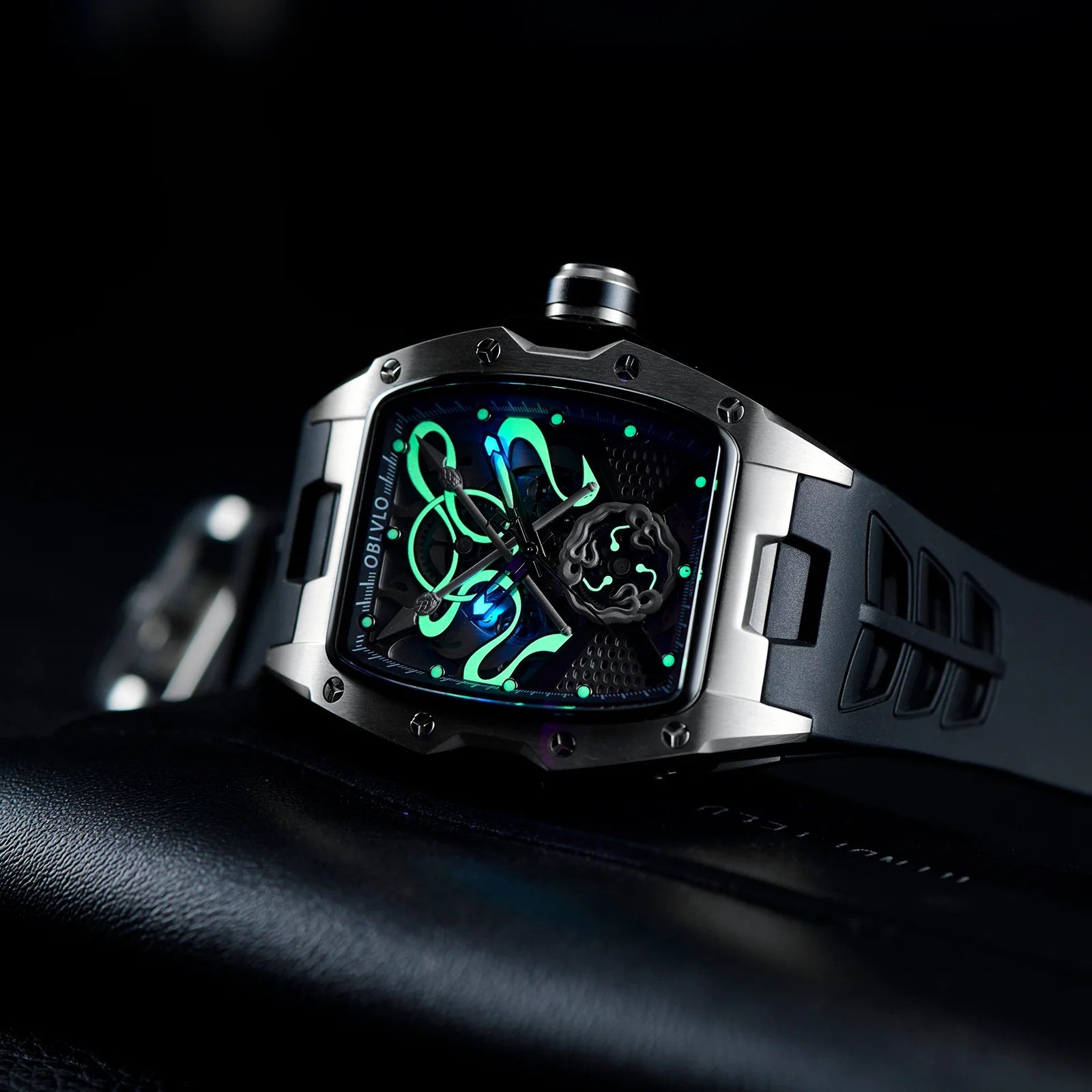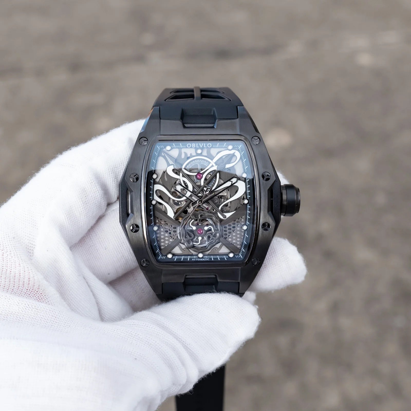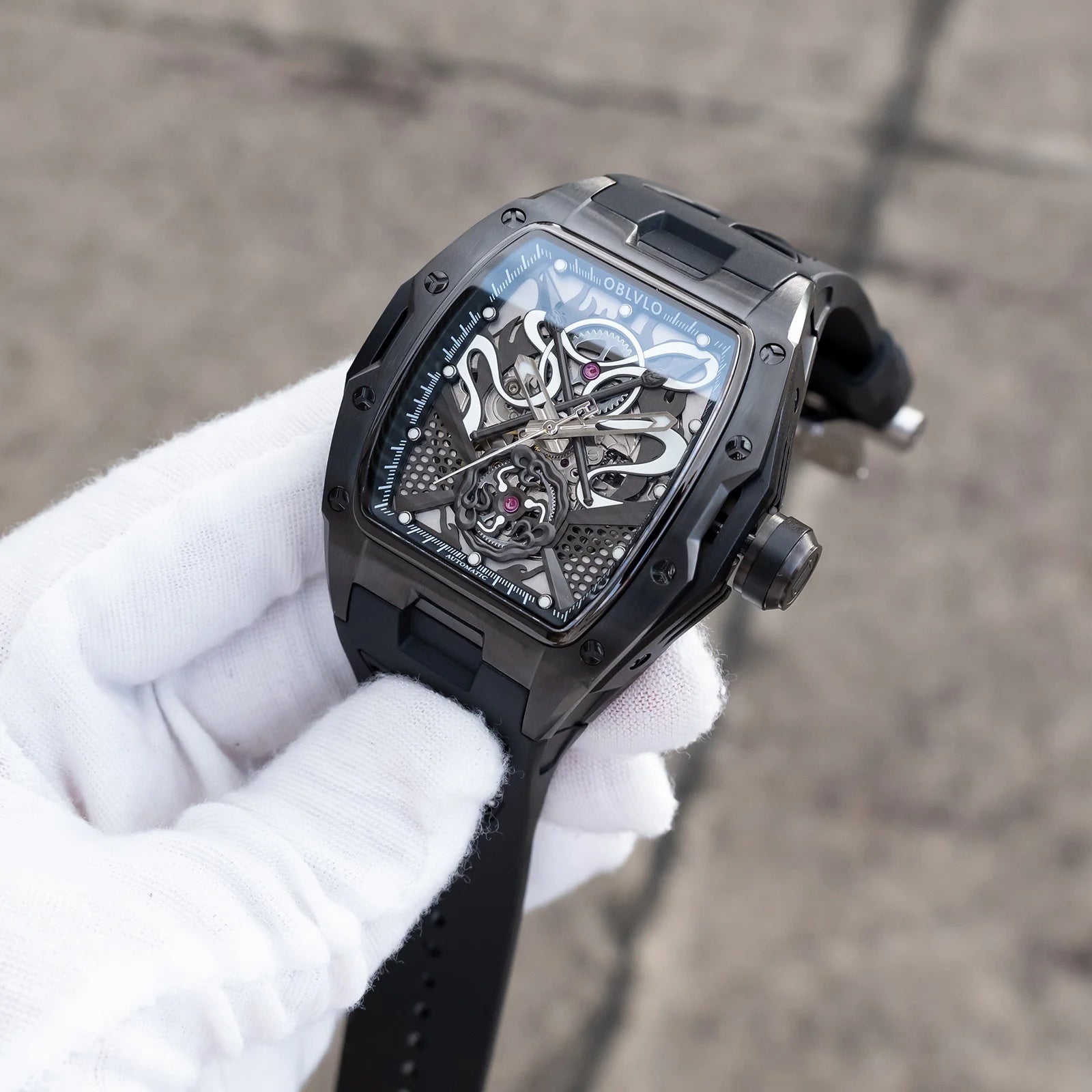 | OBLVLO elevates modern horology with this striking all-black timepiece, defined by its bold architecture and captivating skeletonized dial. At its heart beats the dependable Miyota 82S0 automatic movement, showcased through an intricate display of gears, curves, and mechanical artistry. The brushed black case and matching strap create a seamless, powerful silhouette that exudes contemporary luxury. Every detail—from the precision-cut framework to the luminous accents—reflects OBLVLO’s dedication to refined craftsmanship. This watch stands as a statement of sophistication, innovation, and commanding style. |