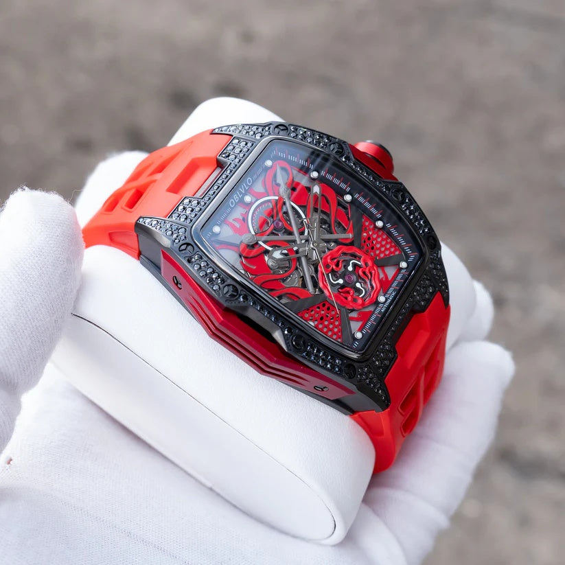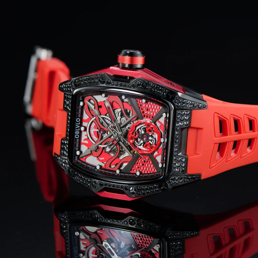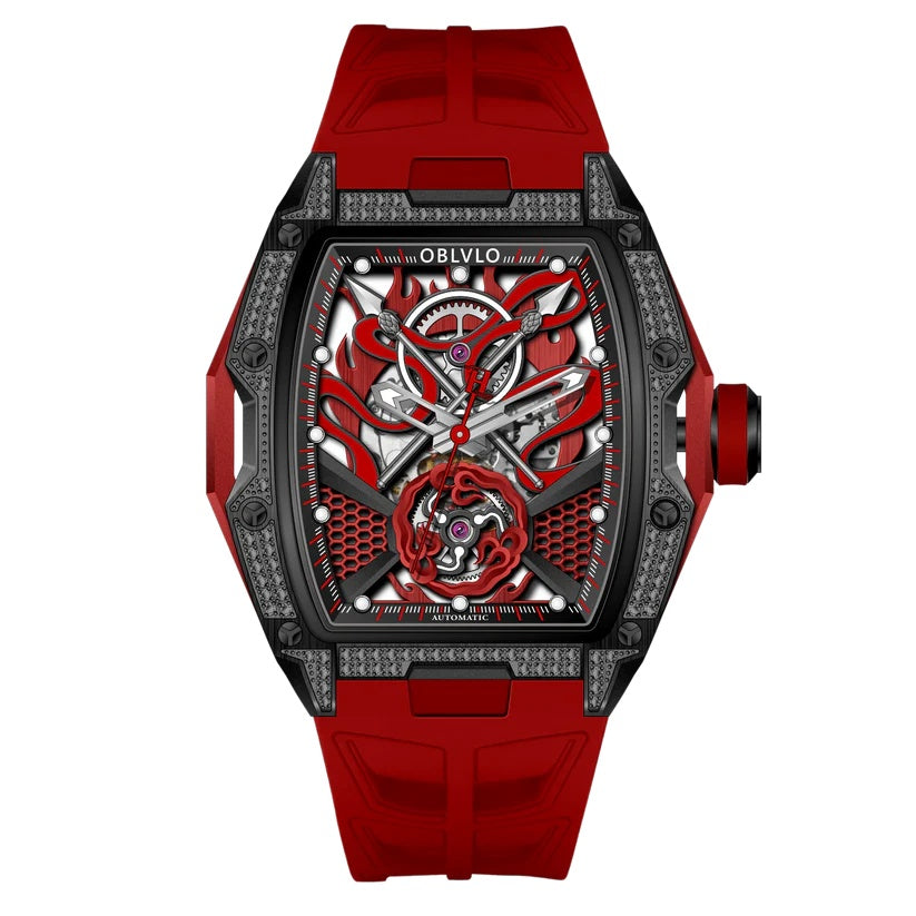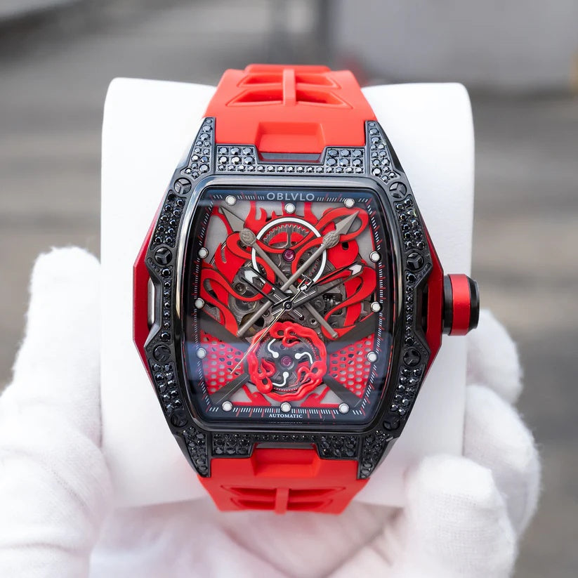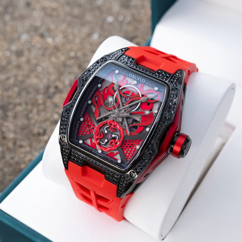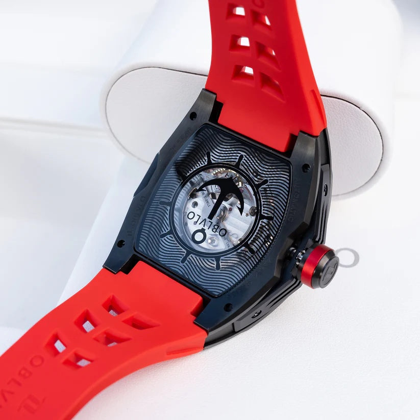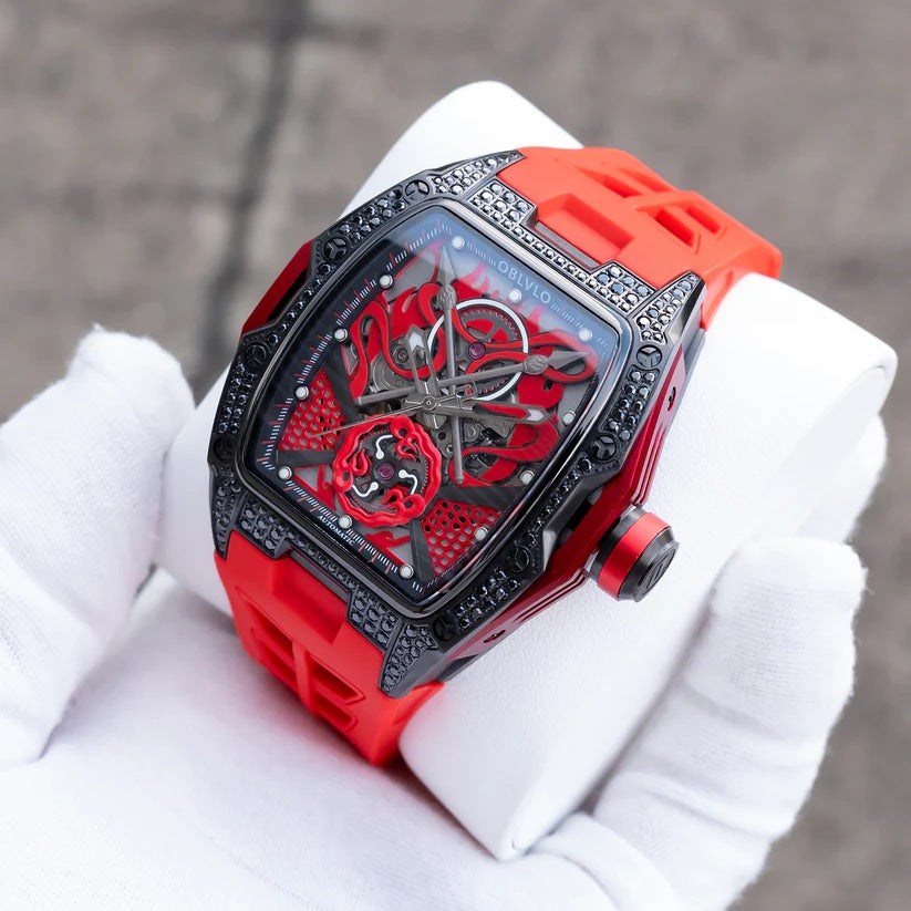 | OBLVLO unveils a striking fusion of avant-garde design and refined craftsmanship with this bold timepiece, powered by the reliable Miyota 82S0 automatic movement. Its intricately skeletonized dial reveals a symphony of gears and curves, framed by a commanding tonneau-shaped case that radiates contemporary luxury. Vivid red accents and sculpted detailing give the watch an unmistakable presence, turning every glance into an experience. Premium materials and meticulous finishing showcase OBLVLO’s dedication to precision and artistry. This is more than a watch—it’s a statement of power, passion, and elevated sophistication. |