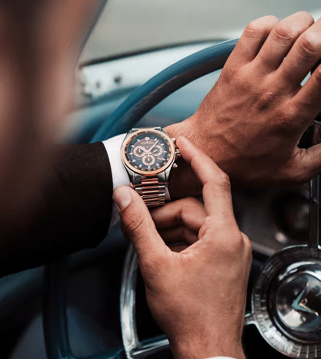 This multifunctional watch combines noble design with reliable functions in Swiss Made quality. Despite an impressive 44 mm diameter. A pinstripe pattern guilloche causes the almost 3 dimensional look of the clearly arranged dial with 3 subsidiary counters and date window at 4 o'clock. The dial comes in various tasteful color compositions and is edged by a smooth tachymeter bezel. Large pips as hour markers and a fluted crown make the Rockshell Mark III Chrono an outstanding timepiece.