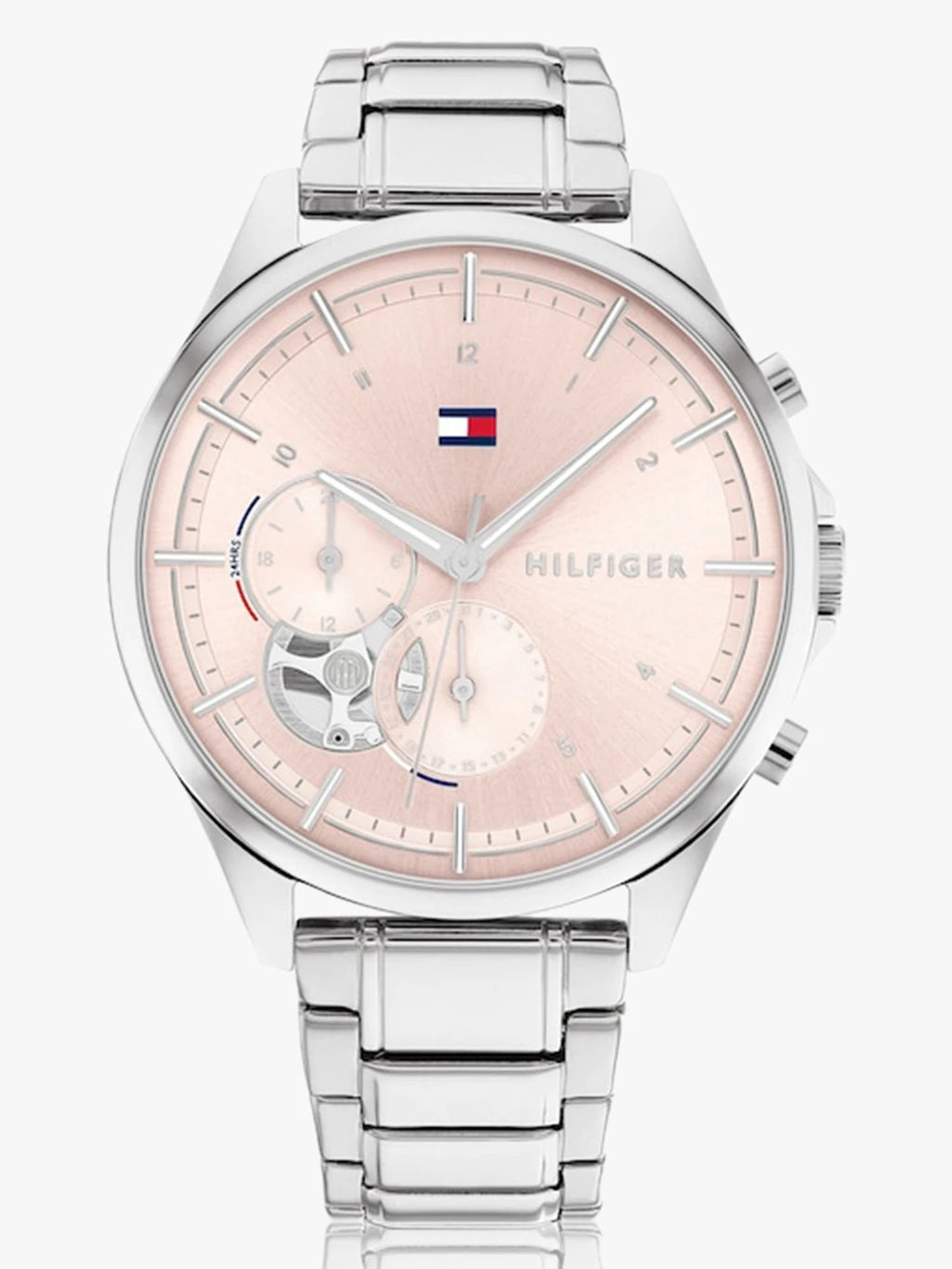 an analog watch designed for women.It features a distinctive pink dial and is designed for casual wear.